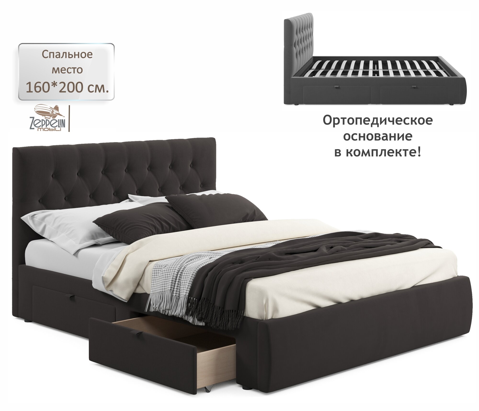 Двуспальная кровать Verona 1600 темная Zeppelin с ящиками и ортопедическим основанием, 160х200, мягкая из велюра, ламели, выкатные ящики