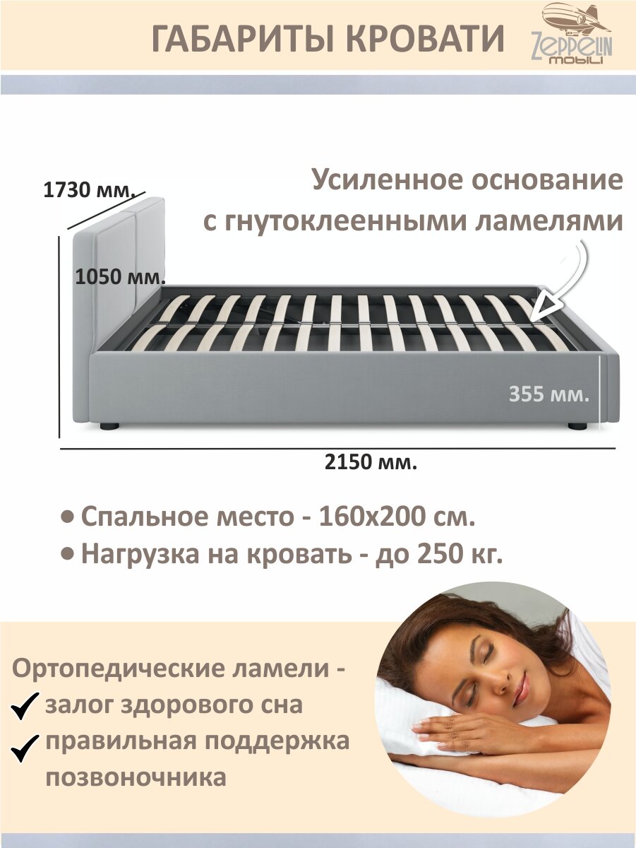 Мягкая кровать Erika 1600 Zeppelin Mobili, велюр, темно- серый (маренго), с подъемным механизмом