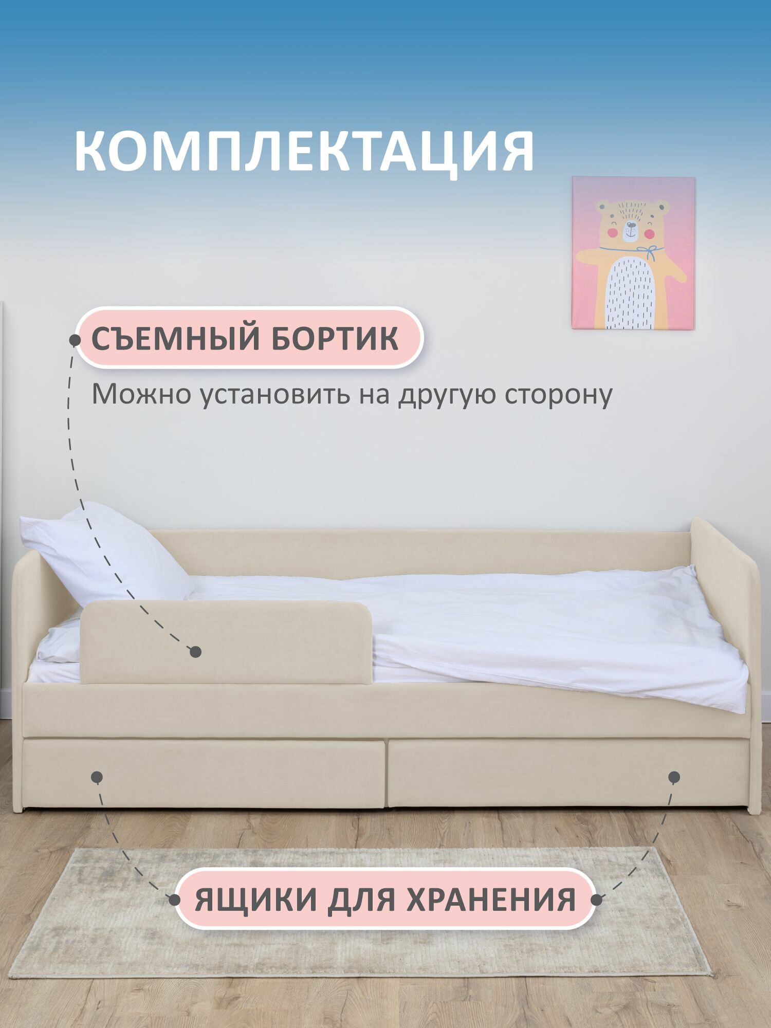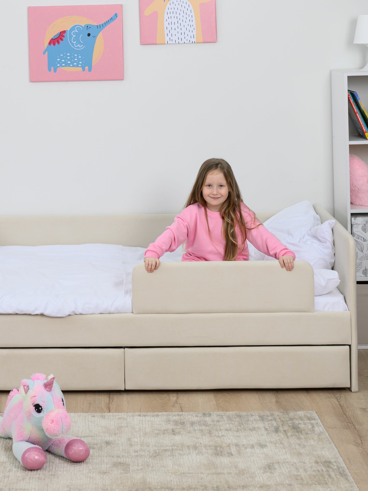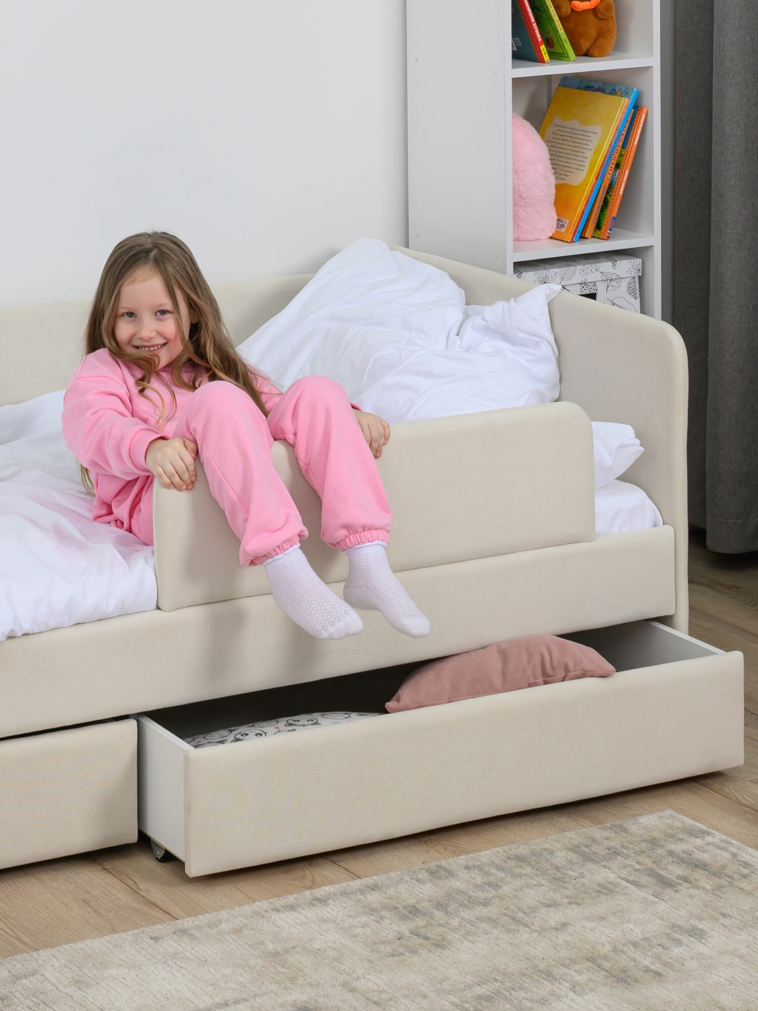 Кровать детская 160x80 Romack Jenny Светло-бежевый с бортиком безопасности, ящиком для белья и ортопедическим основанием
