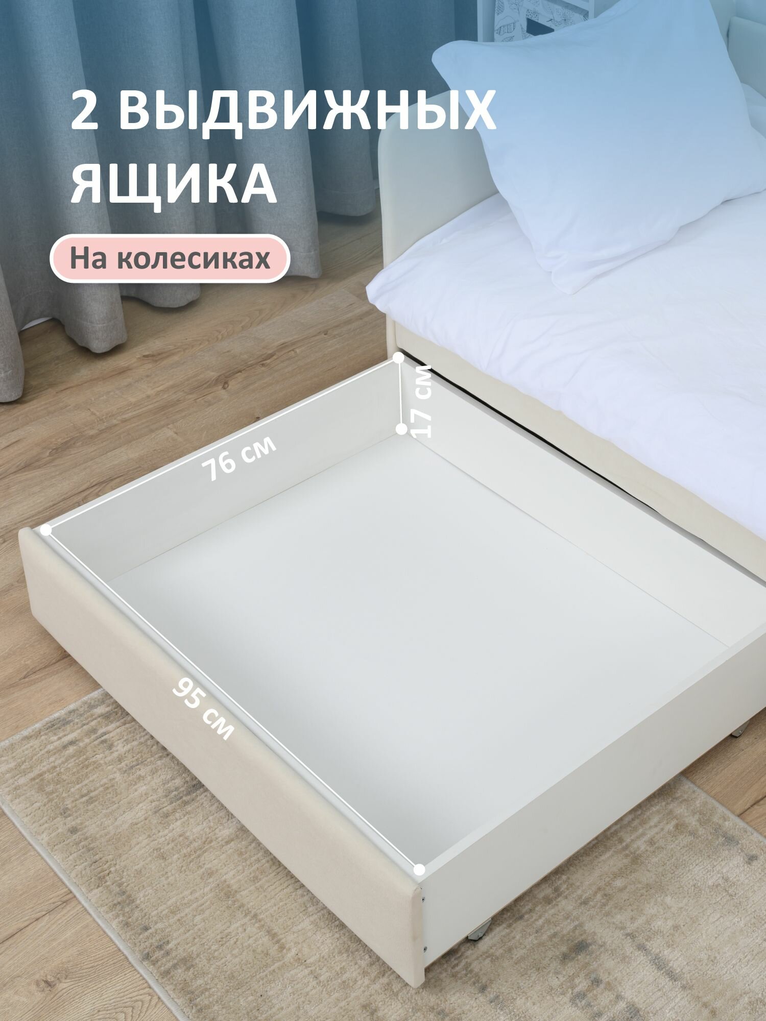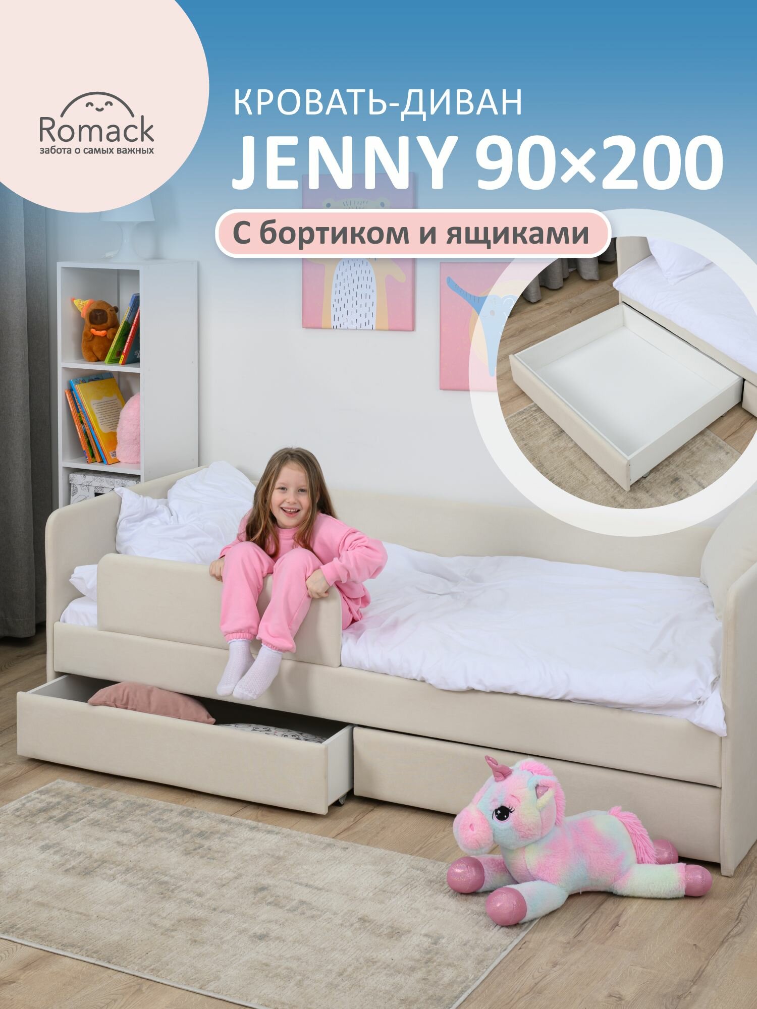 Кровать детская 200x90 Romack Jenny Сапфир с бортиком безопасности, ящиками для хранения и ортопедическим основанием