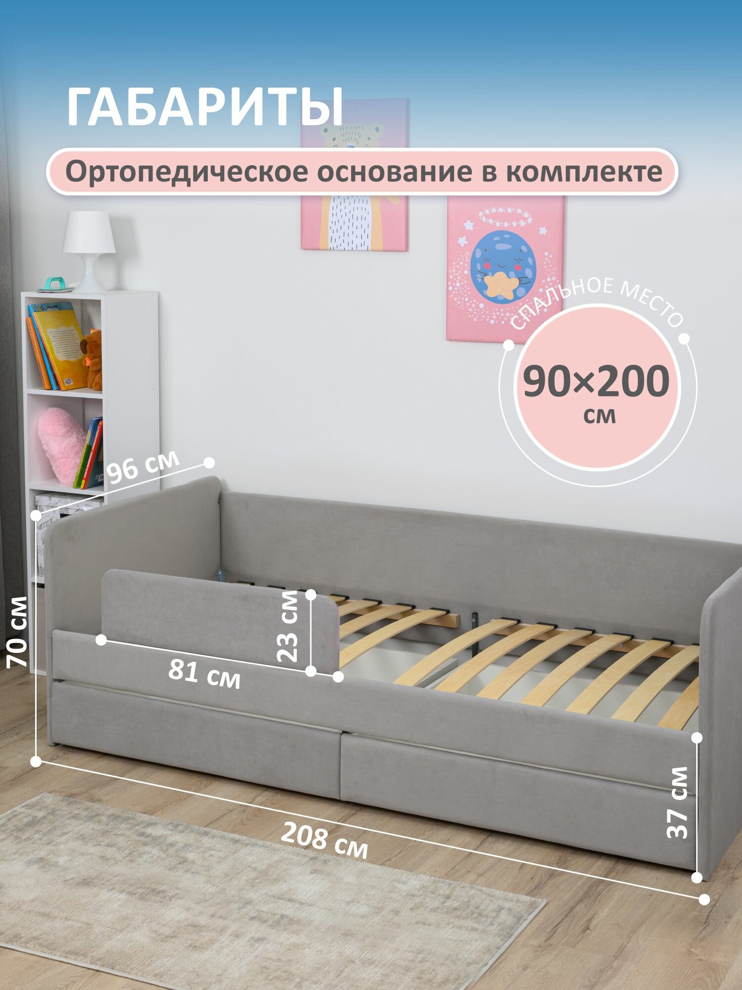 Кровать детская 200x90 Romack Jenny Рогожка грей с бортиком безопасности, ящиками для хранения