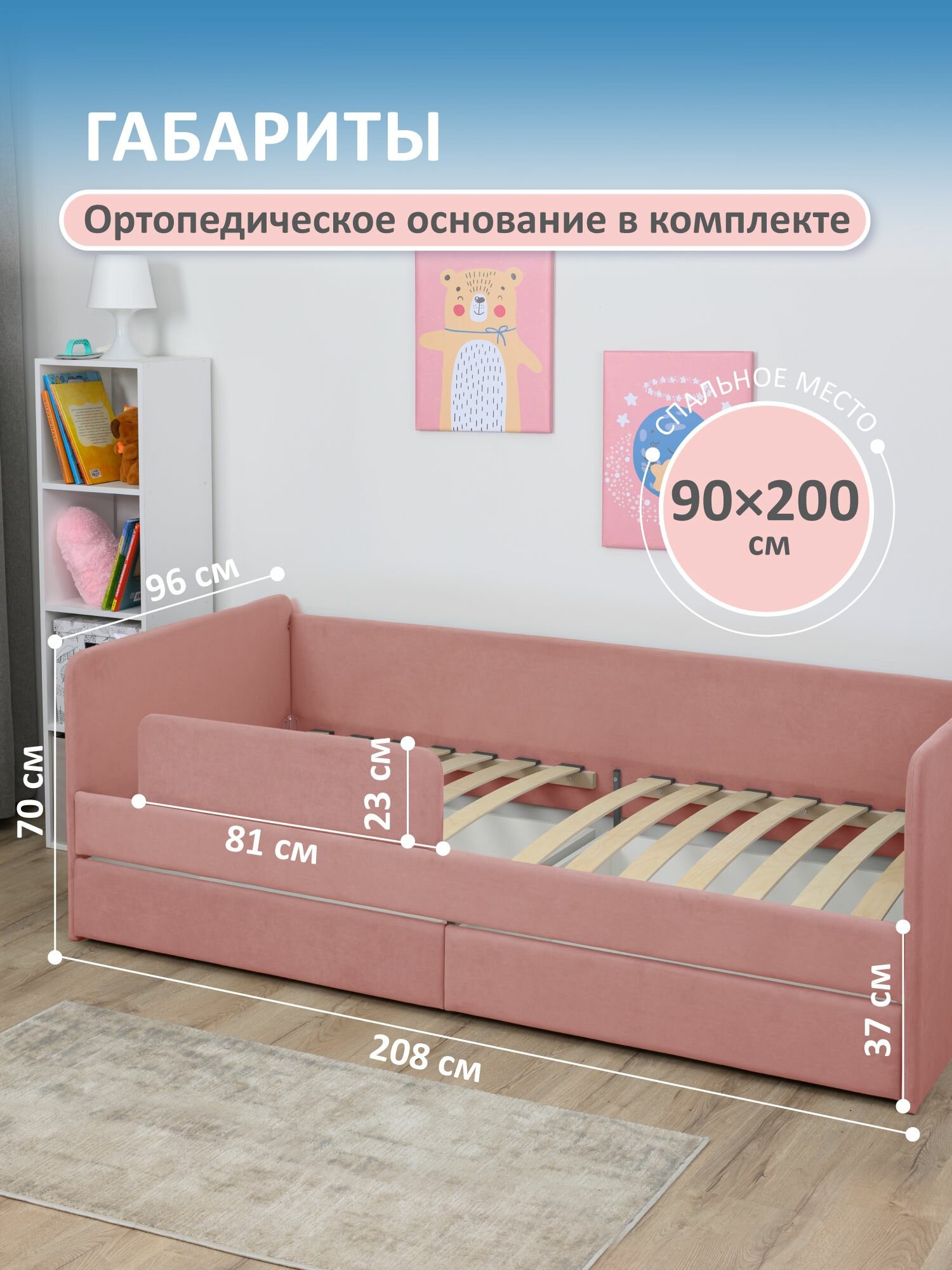 Кровать детская 200x90 Romack Jenny Сапфир с бортиком безопасности, ящиками для хранения и ортопедическим основанием