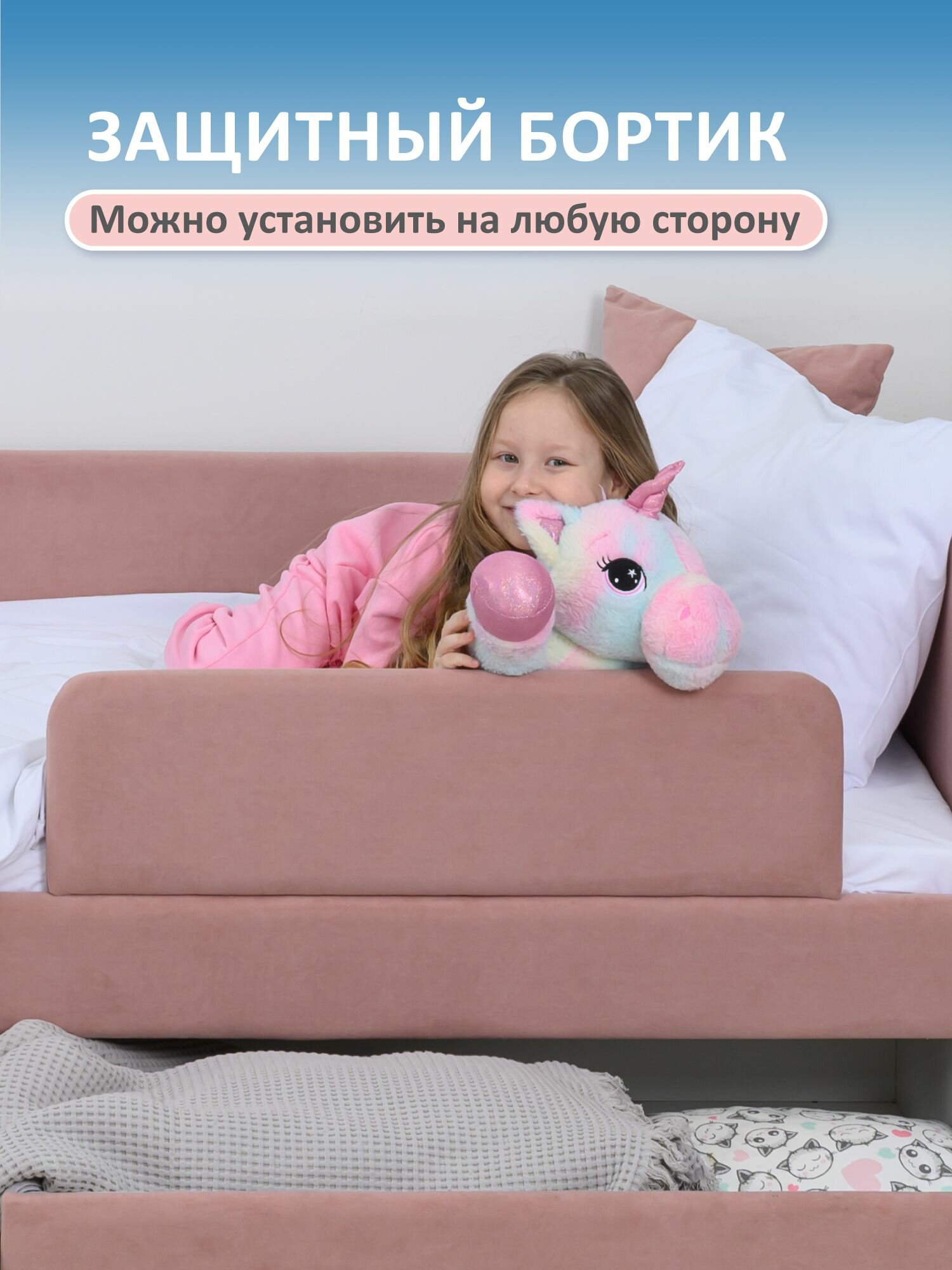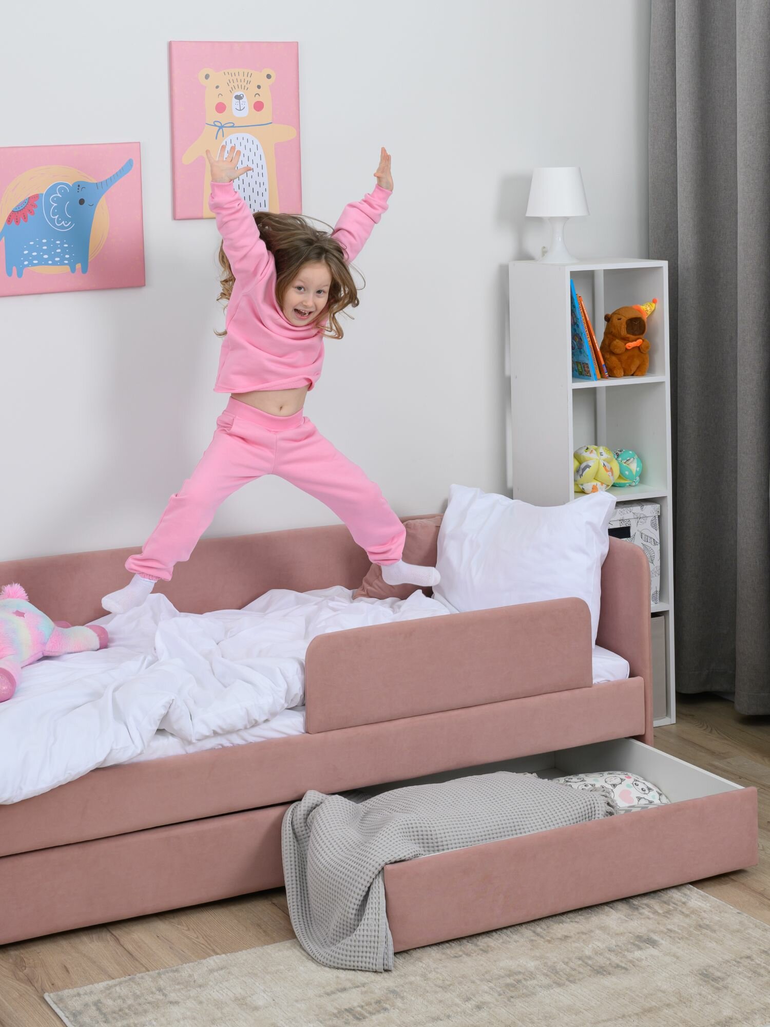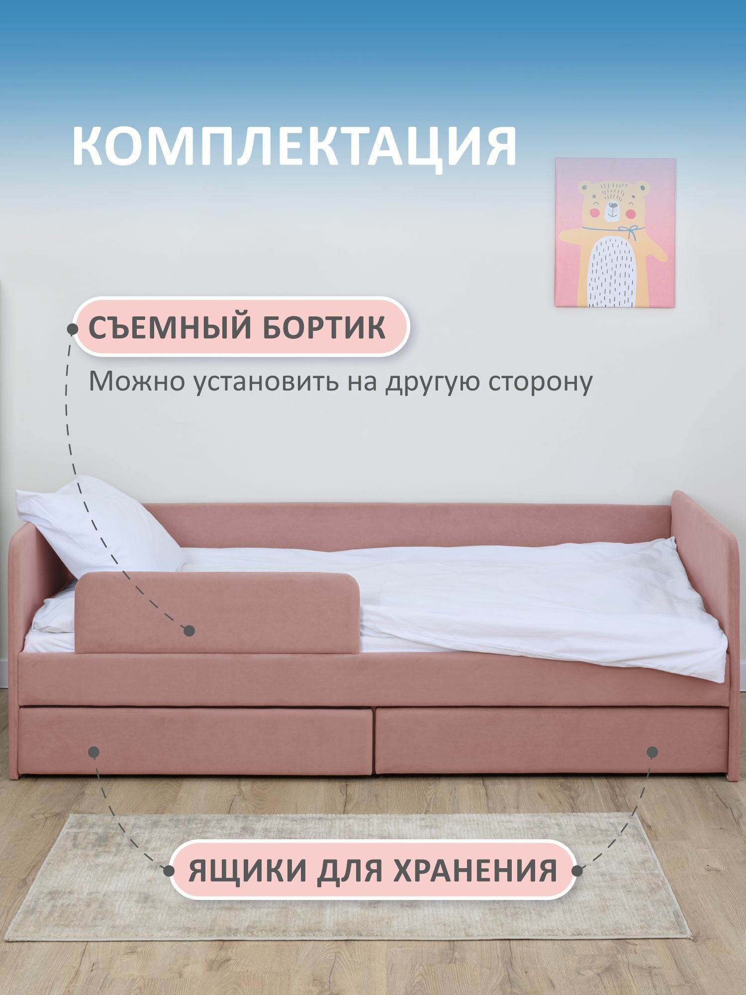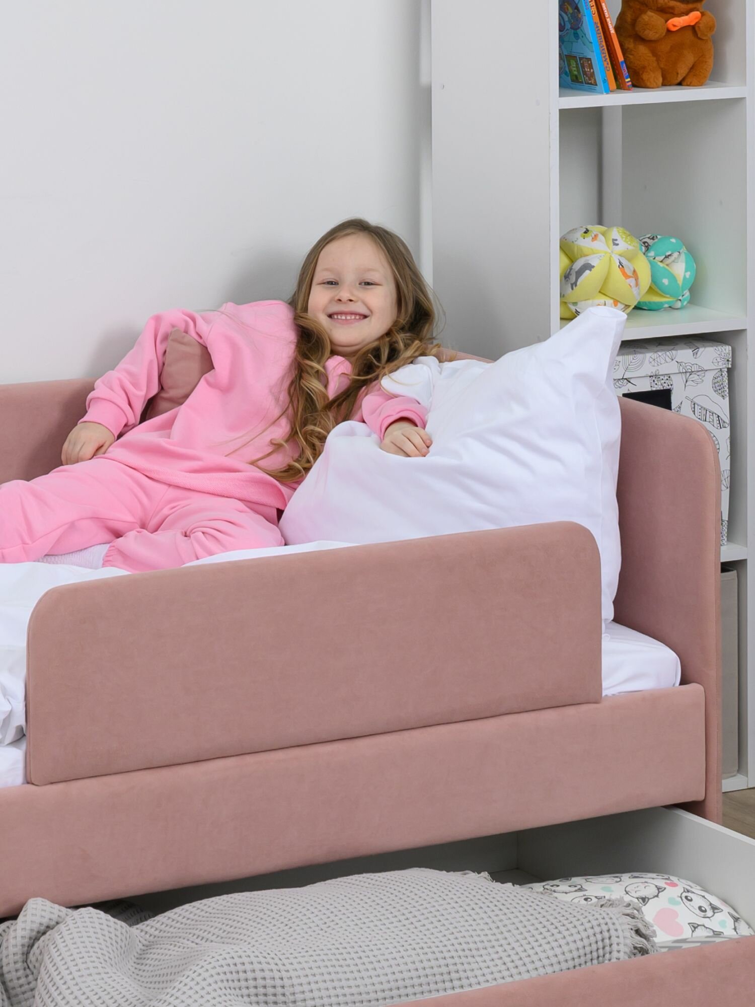 Кровать детская 160x80 Romack Jenny Светло-розовый с бортиком безопасности, ящиком для белья и ортопедическим основанием