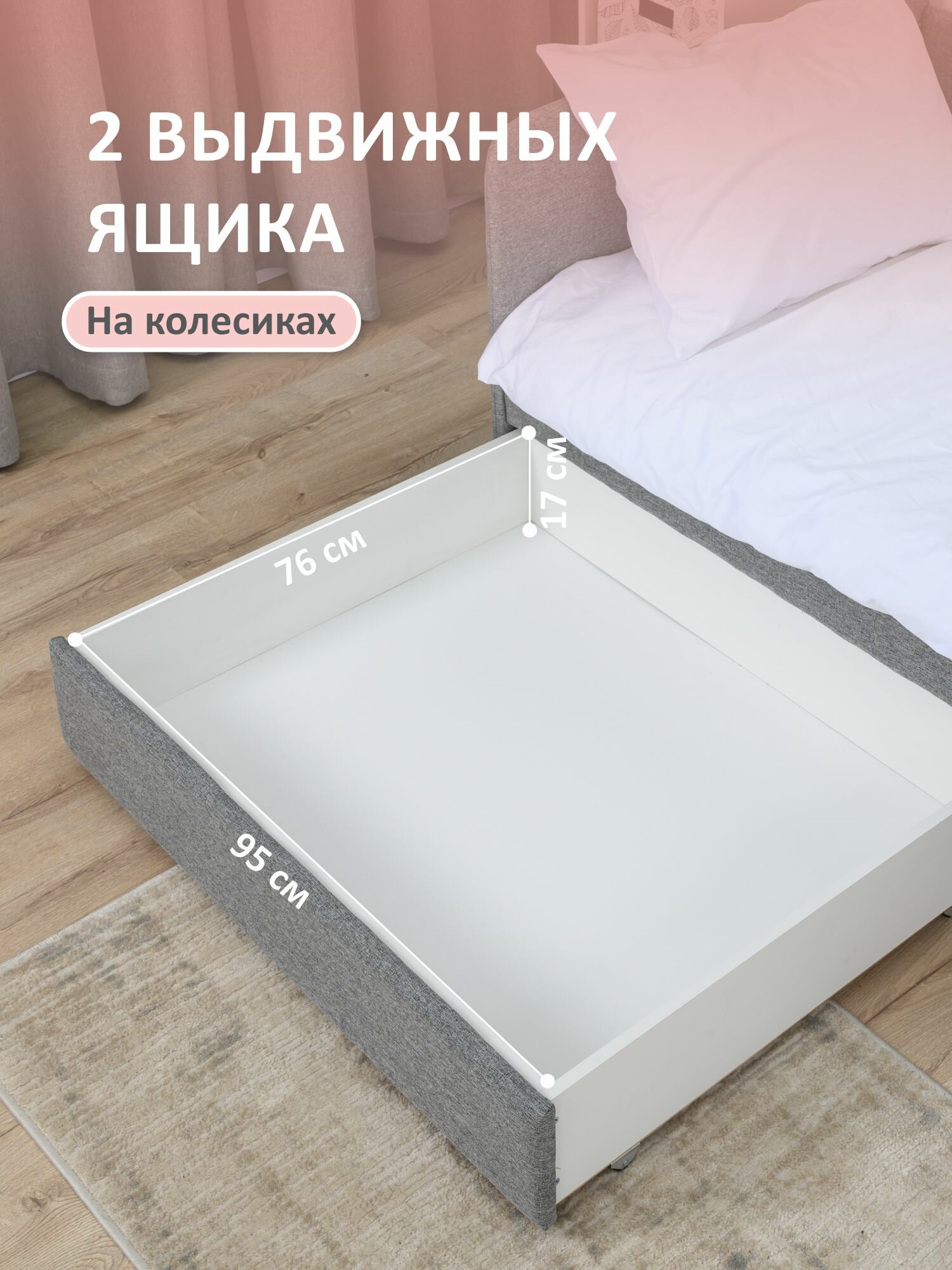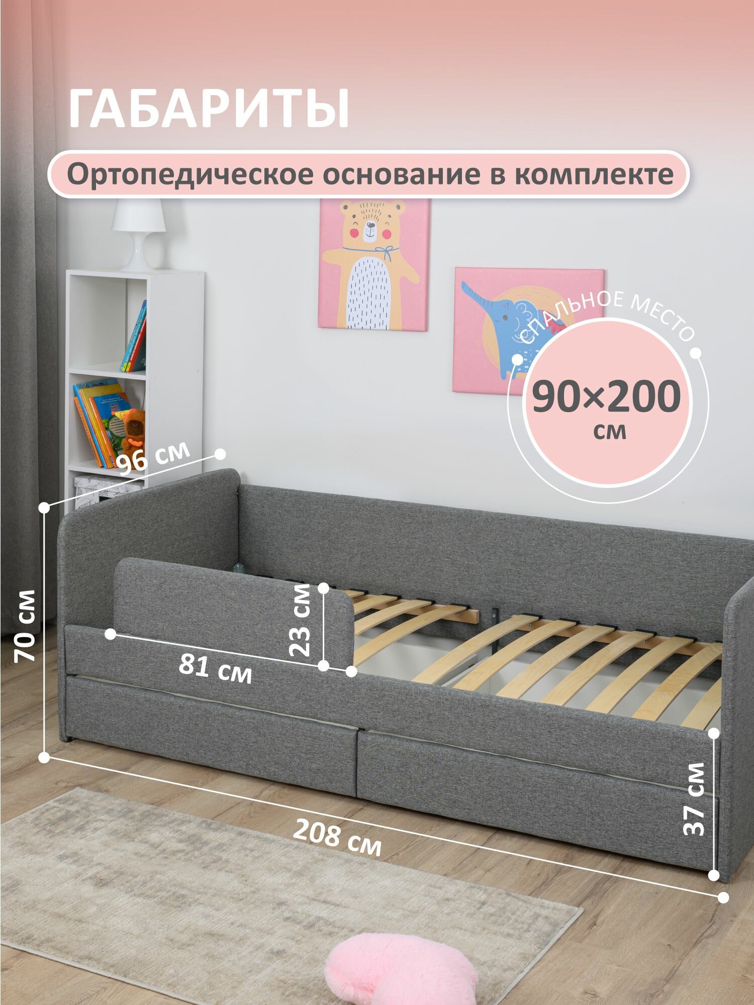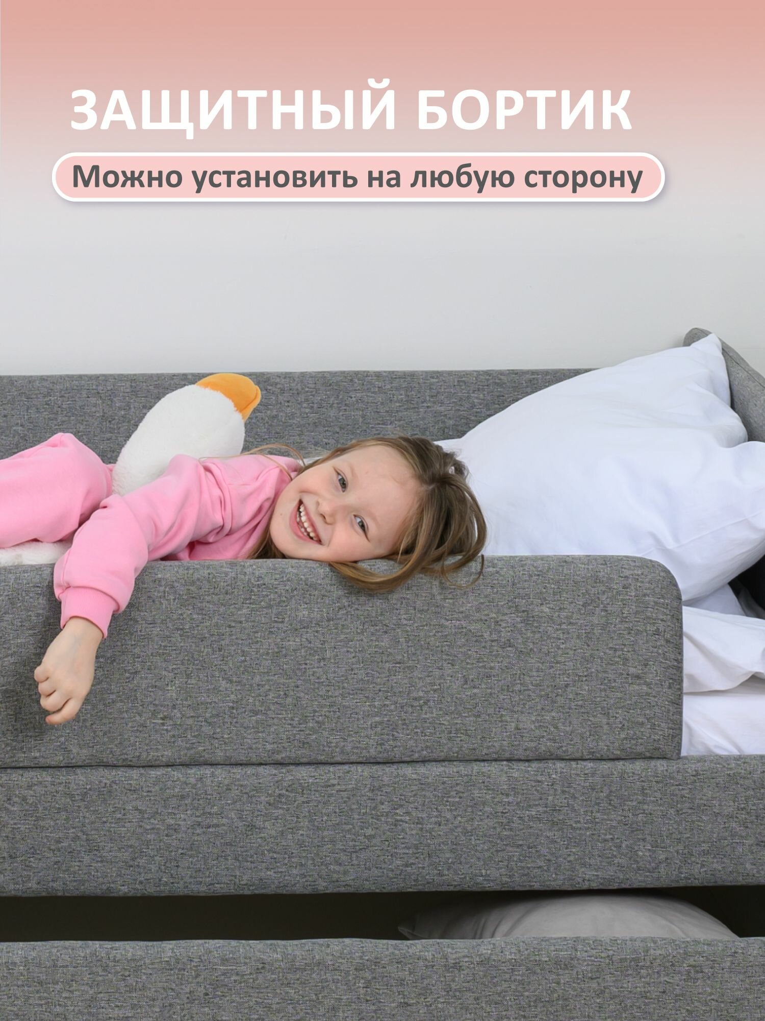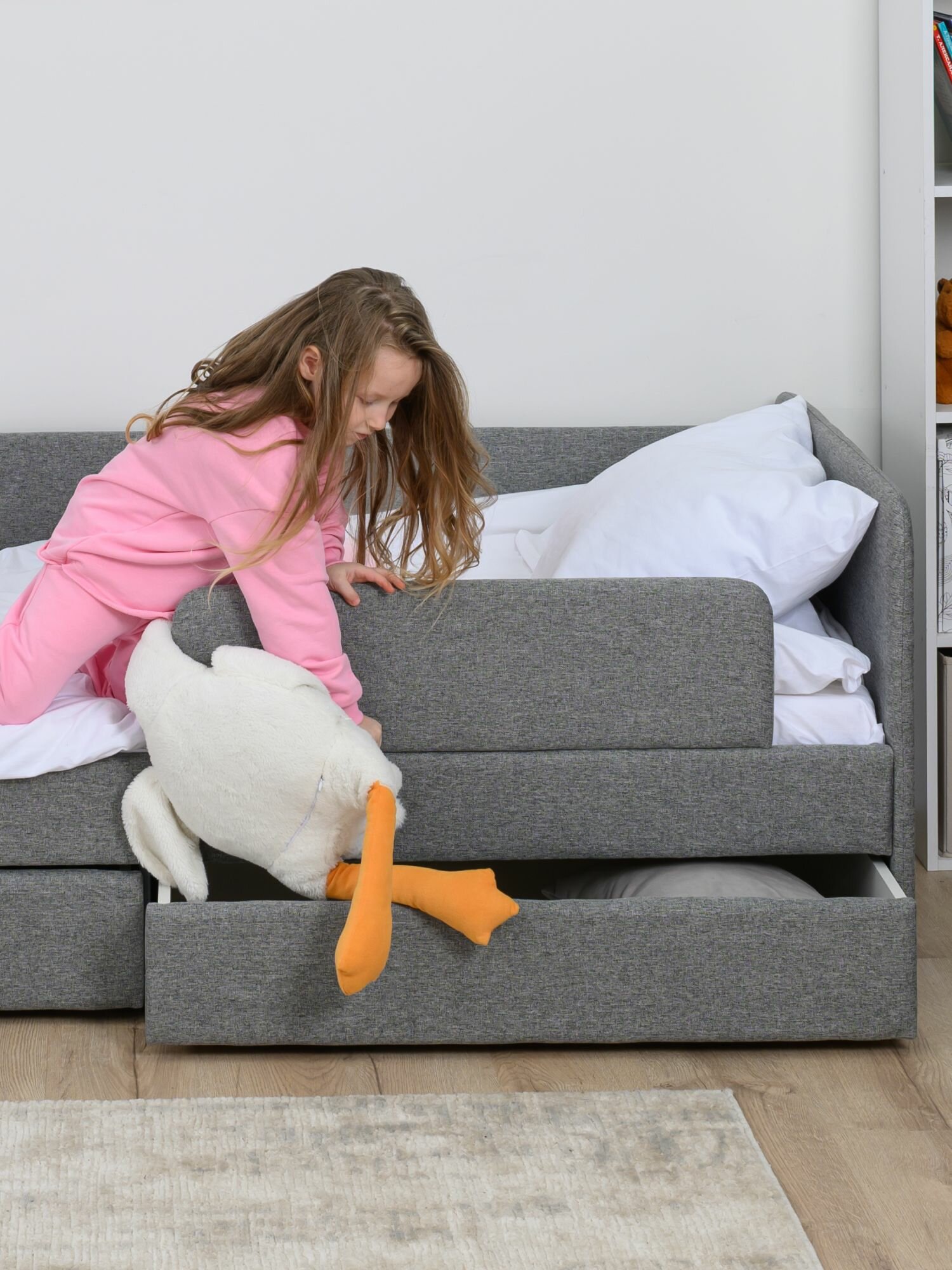Кровать детская 200x90 Romack Jenny Серый пух с бортиком безопасности, ящиками для хранения и ортопедическим основанием