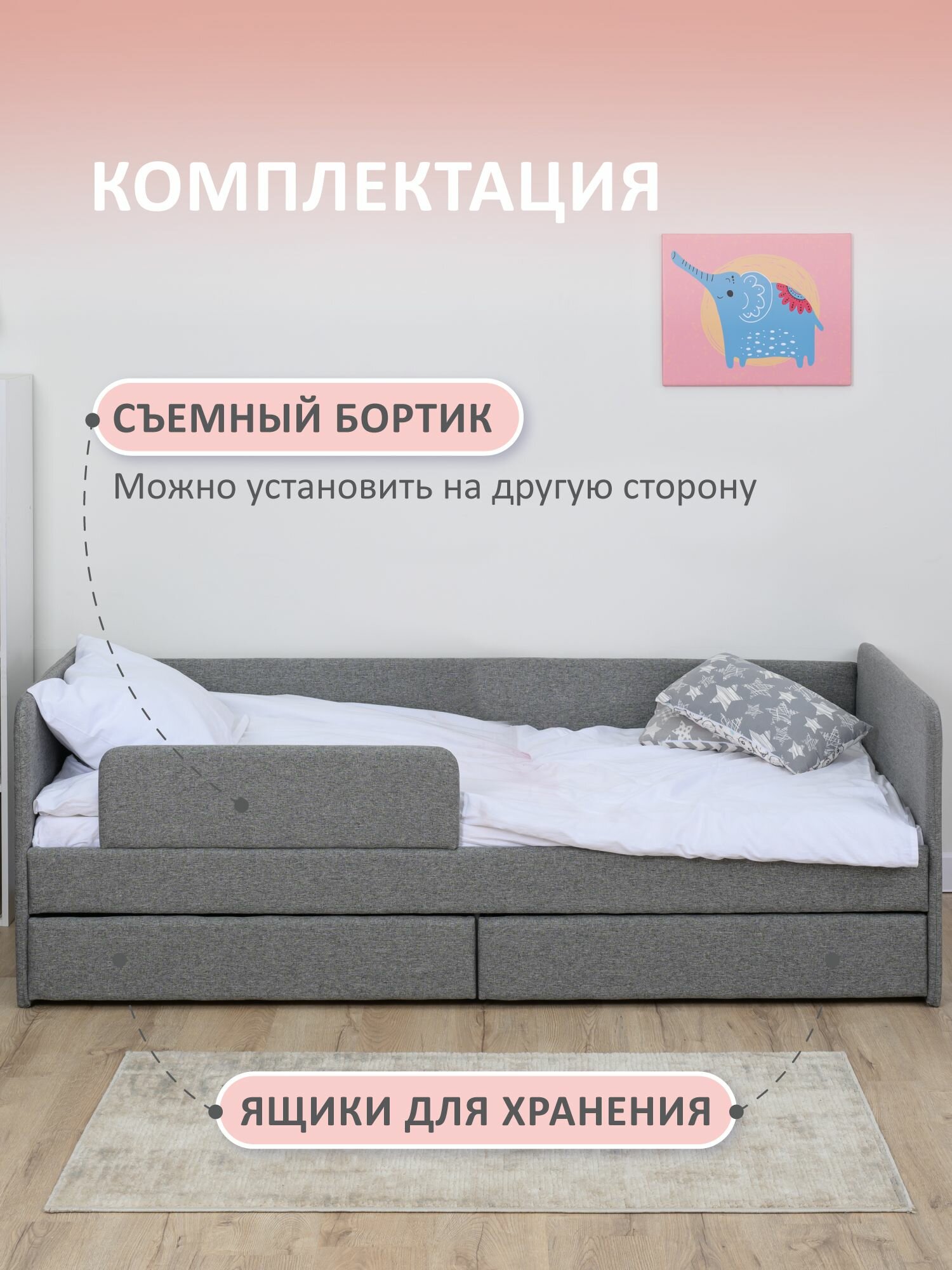 Кровать детская 180x80 Romack Jenny Рогожка грей с бортиком безопасности, ящиком для белья и ортопедическим основанием