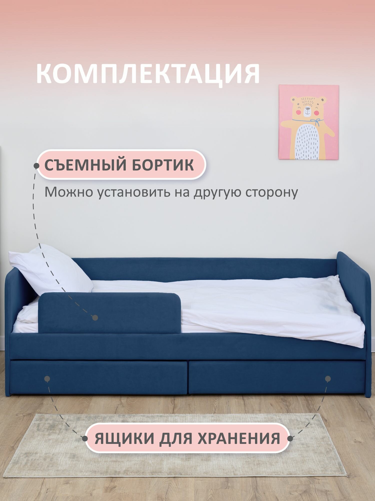 Кровать детская 180x80 Romack Jenny Сапфир с бортиком безопасности, ящиком для белья и ортопедическим основанием
