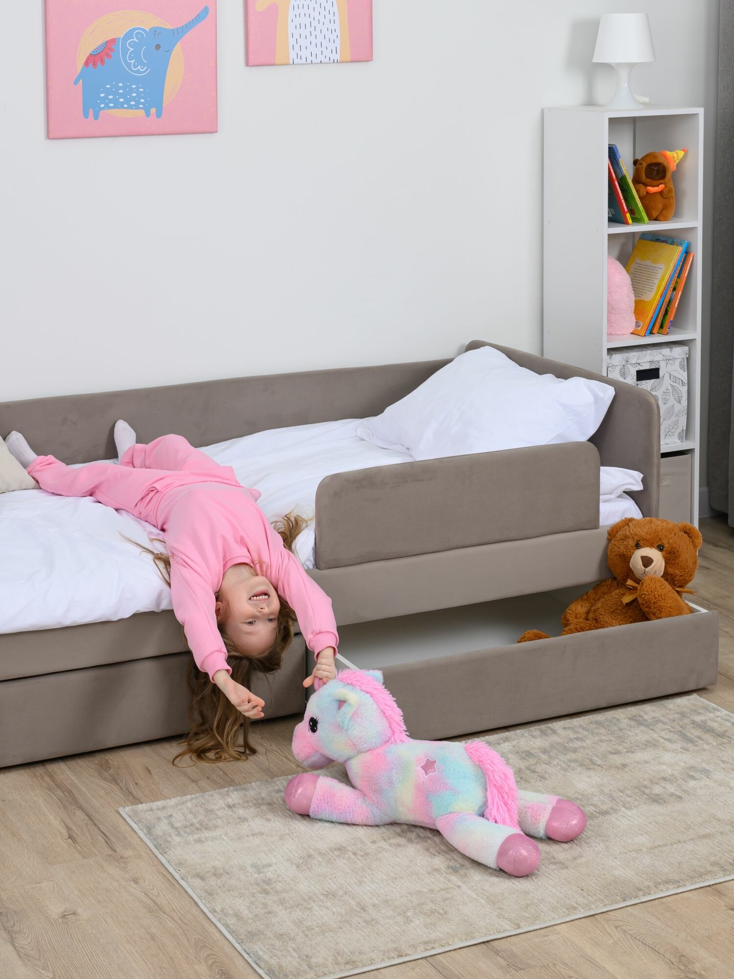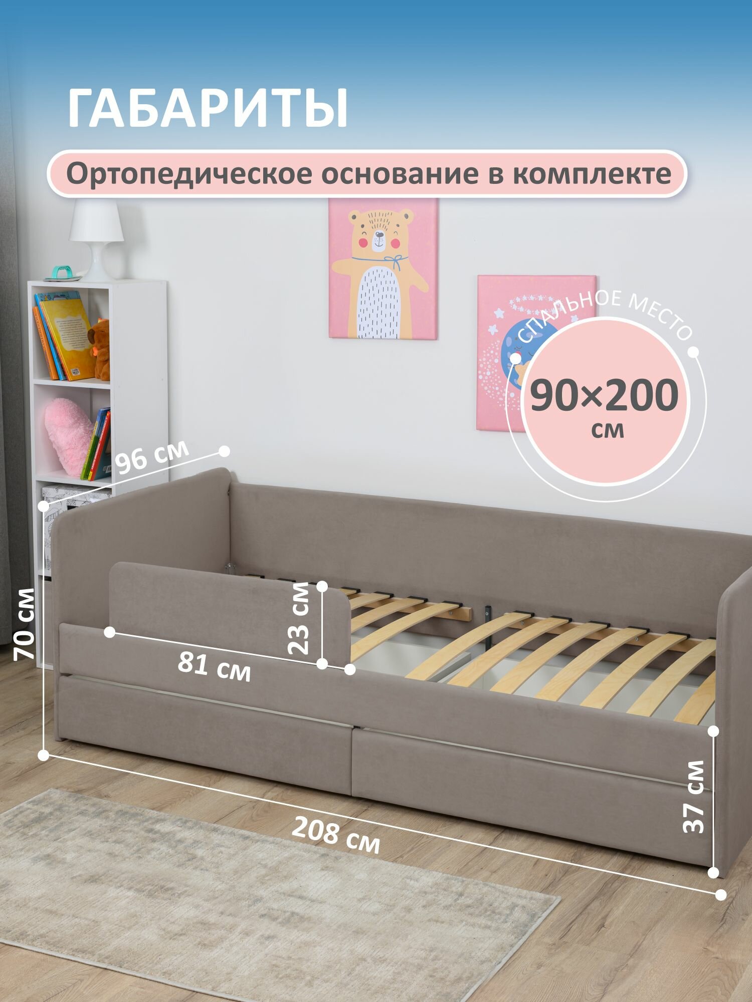 Кровать детская 200x90 Romack Jenny Рогожка грей с бортиком безопасности, ящиками для хранения