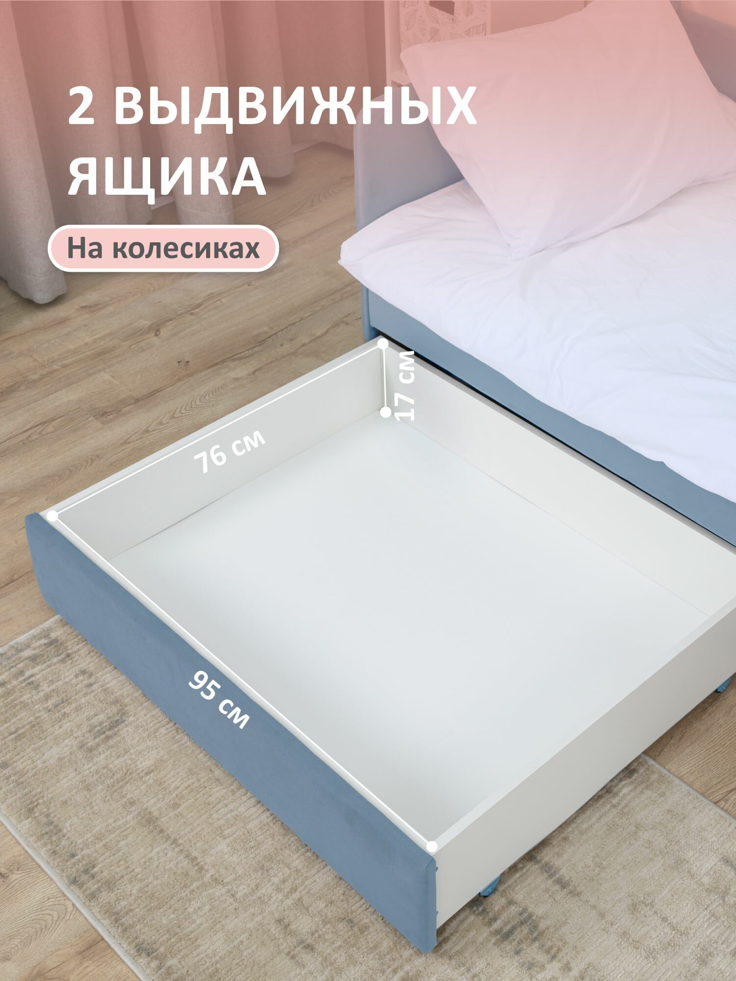 Кровать детская 200x90 Romack Jenny Сапфир с бортиком безопасности, ящиками для хранения и ортопедическим основанием