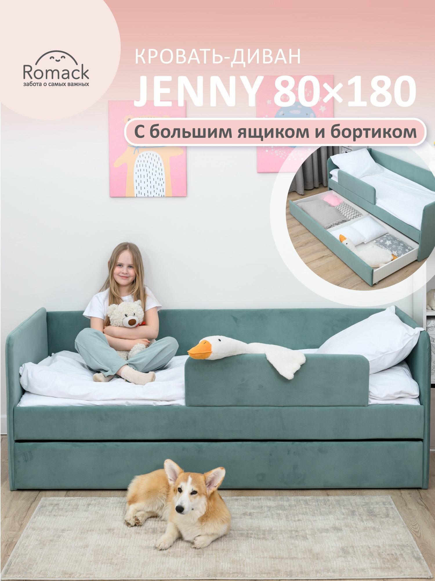 СохранитьКровать детская 180x80 Romack Jenny Мята с бортиком безопасности, ящиком для белья и ортопедическим основанием интересное: