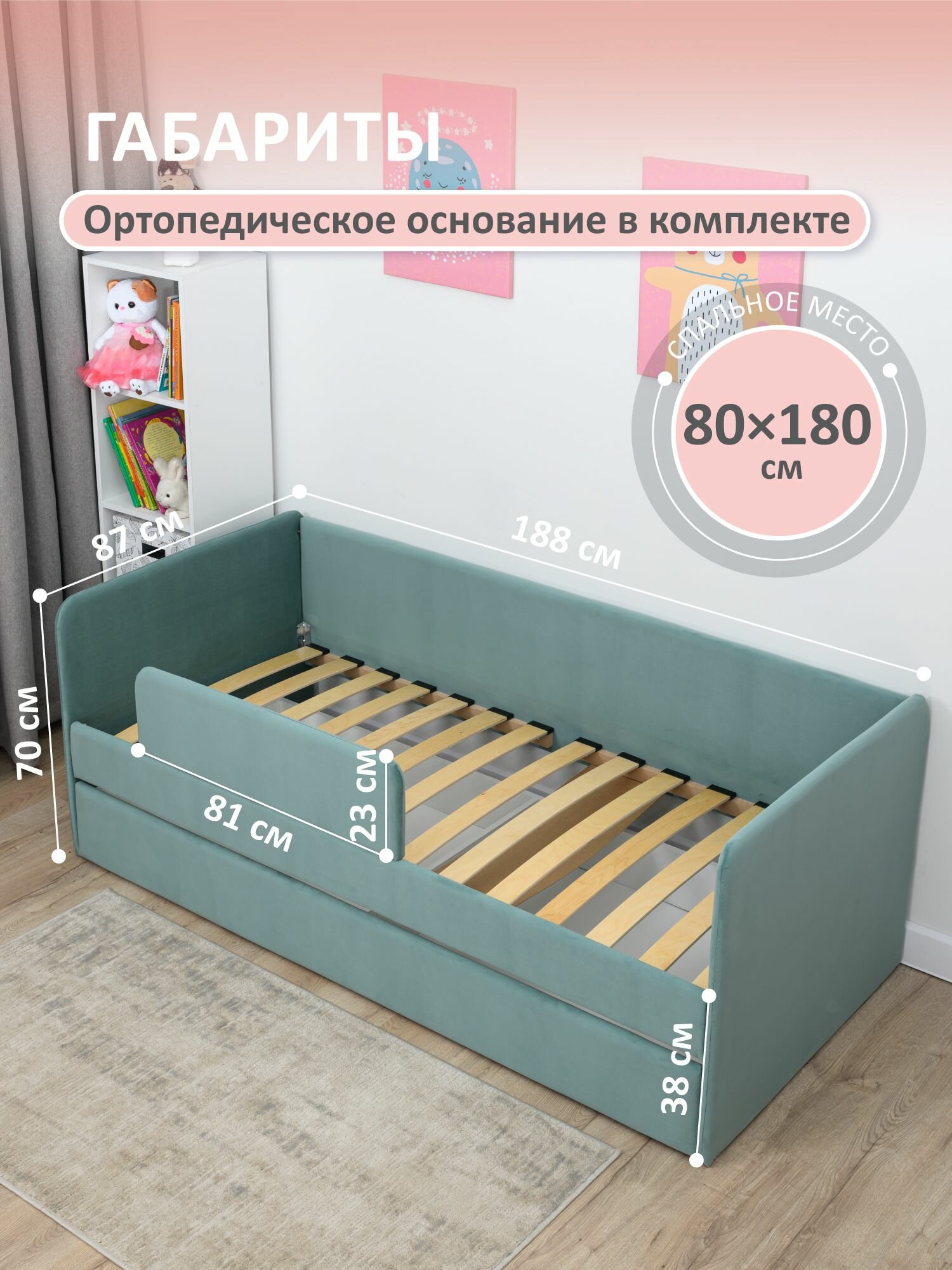 Купить Кровать детская 180x80 Romack Jenny Мята с бортиком безопасности, ящиком для белья и ортопедическим основанием