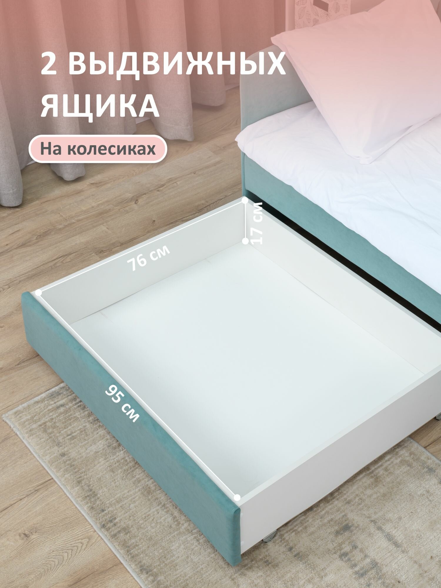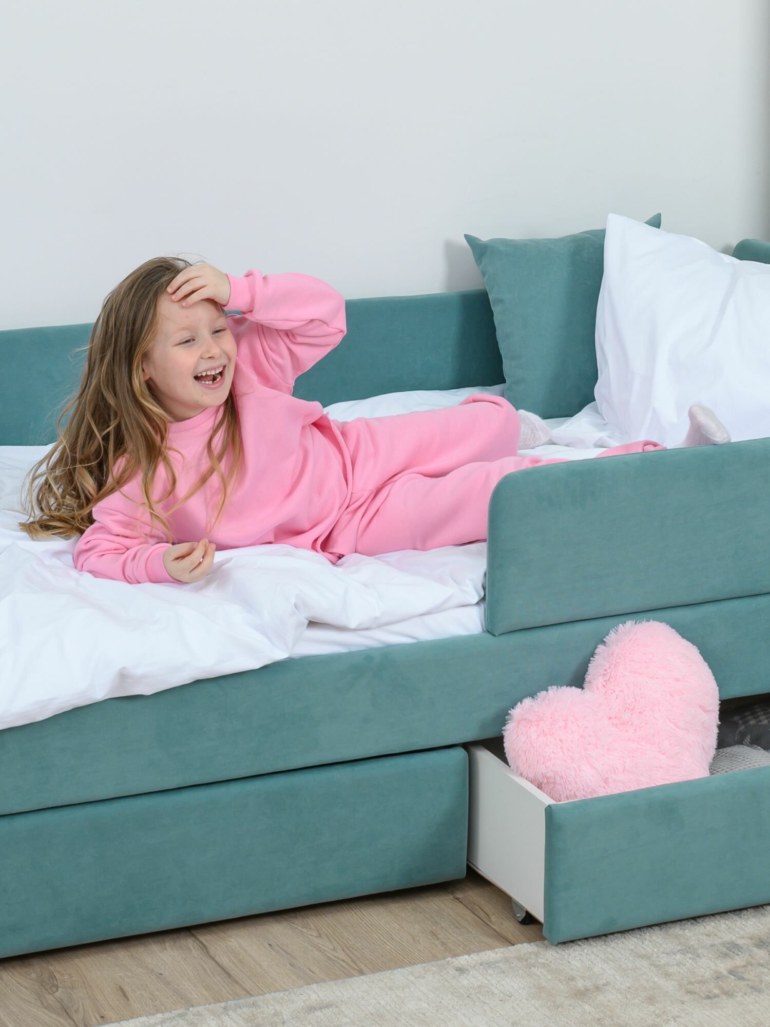 Купить Кровать детская 200x90 Romack Jenny Мята с бортиком безопасности, ящиками для хранения и ортопедическим основанием
