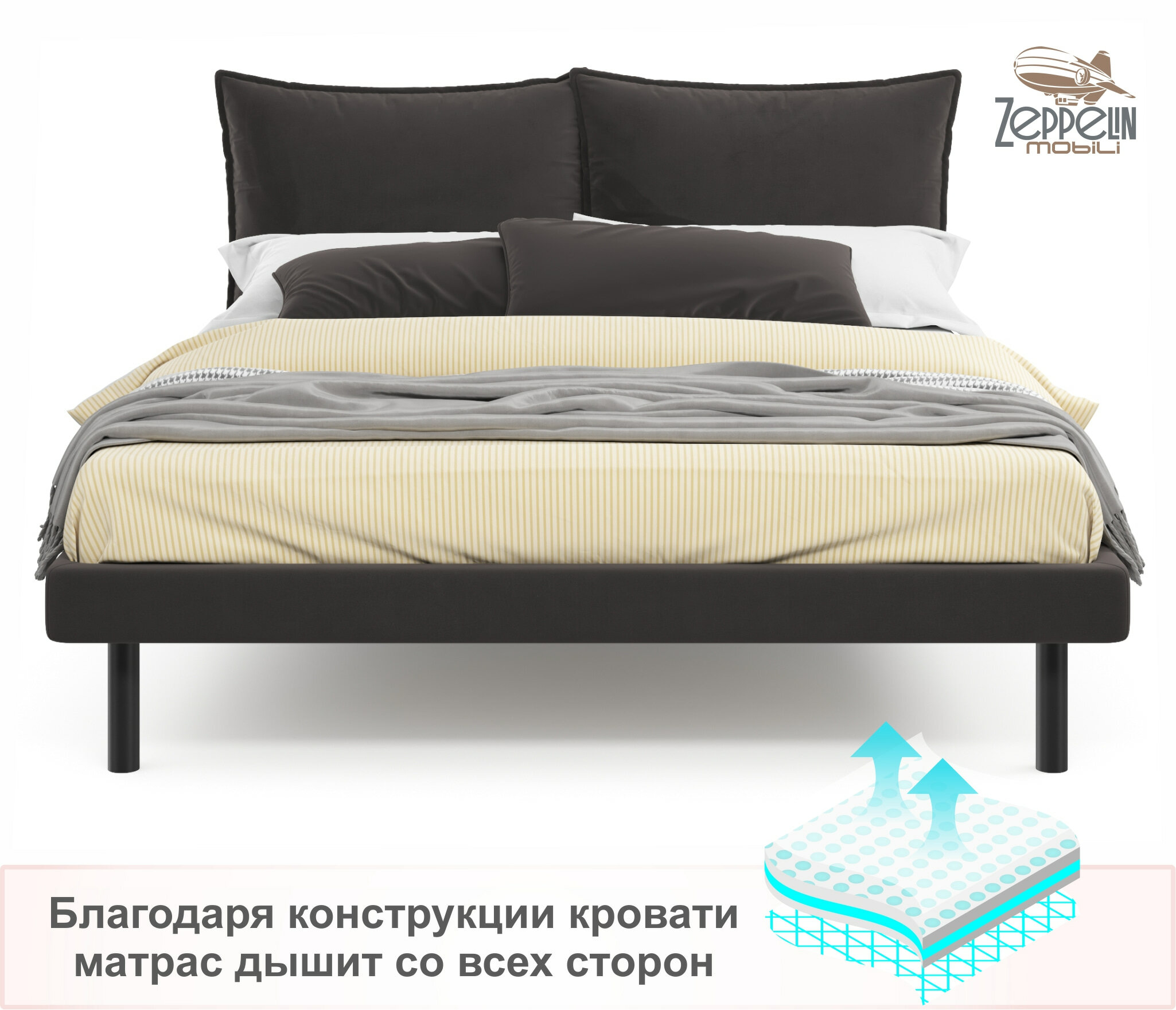 Кровать двуспальная Fly 140х200 темная Zeppelin с ортопедическим основанием, мягкая из велюра, ламели, на ножках