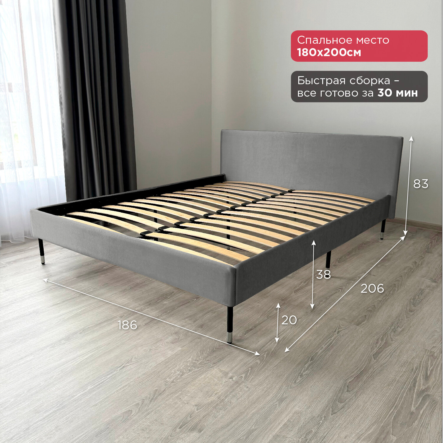 Кровать с матрасом Роза Серая Велюр 160х200