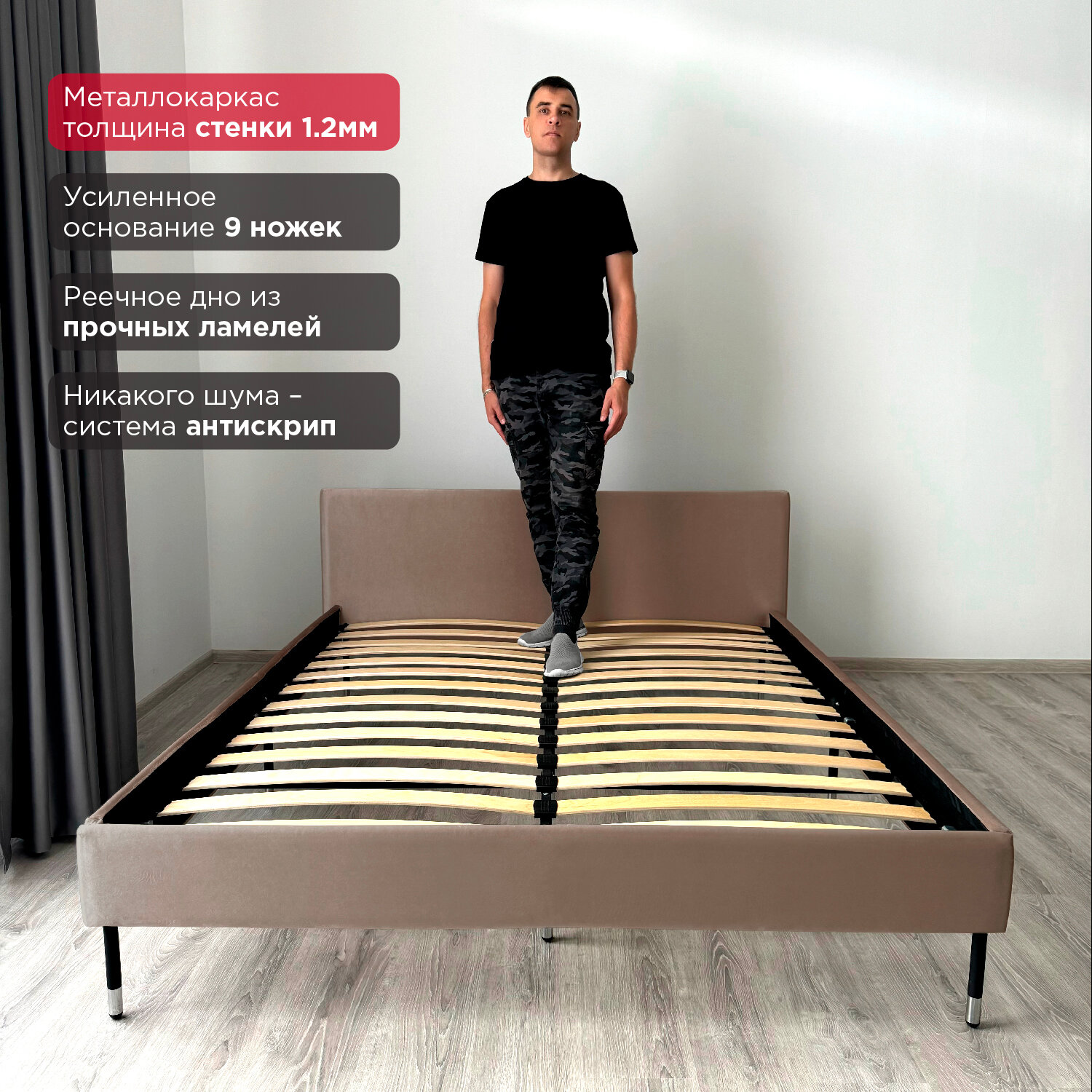 Кровать Redsofa Сити темно-бежевый Шайн / ножки хром 180х200 с ортопедическим основанием