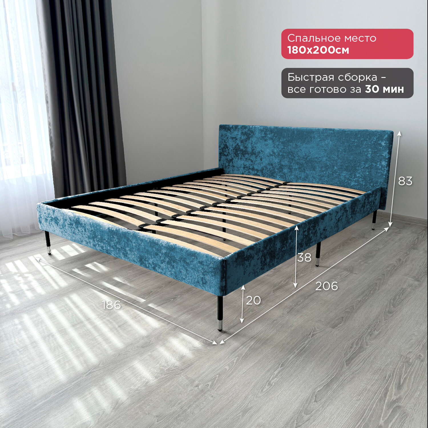 Кровать Redsofa Сити синий Teddi / ножки хром 180х200 с ортопедическим основанием