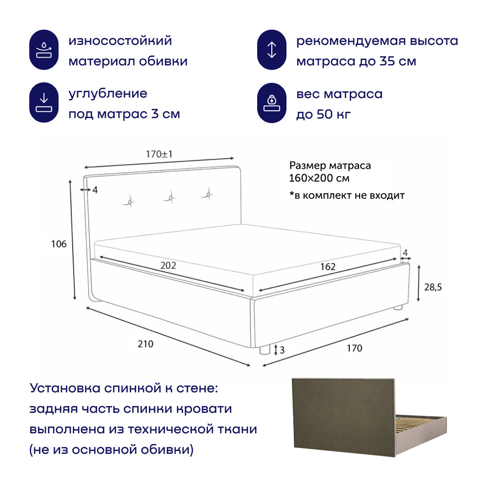 Двуспальная кровать buyson BuyRelax 200х140, серо-синий, микровелюр