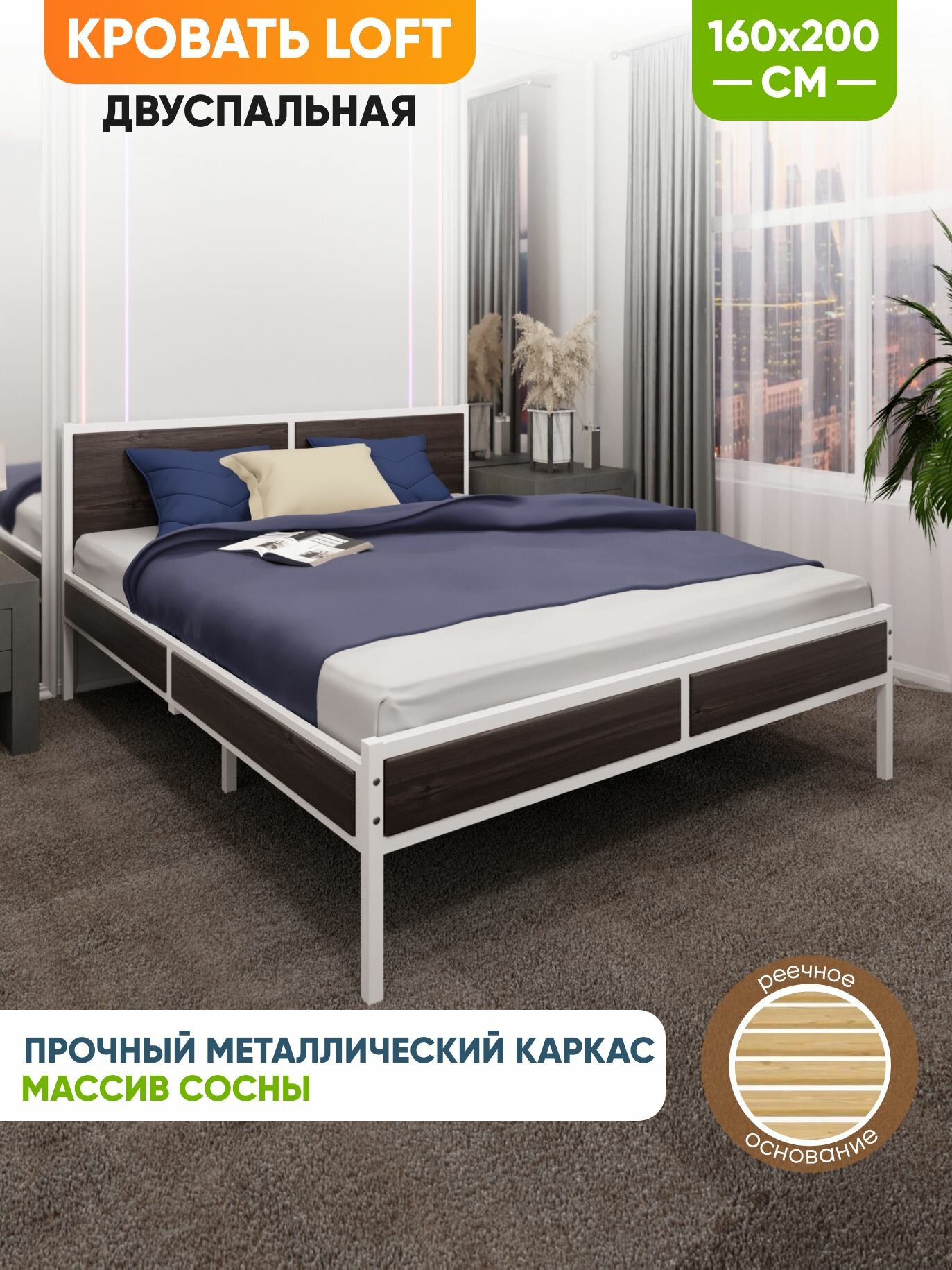 Купить Кровать двуспальная Лофт с реечным основанием, цвет венге с белым металлическим каркасом, 160х200 см