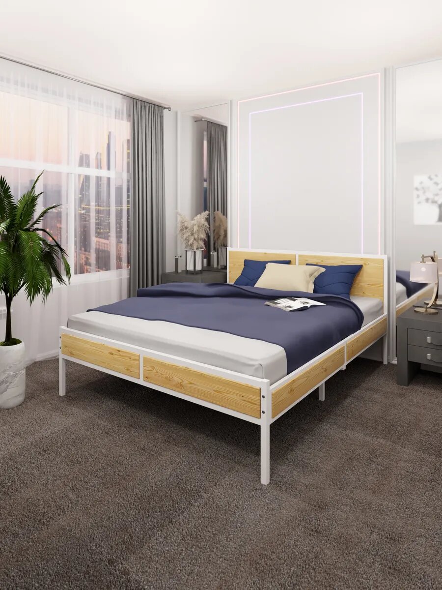 Кровать двуспальная Лофт с реечным основанием, лакированная с белым металлическим каркасом, 140х200 см