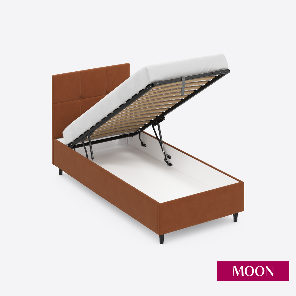 СохранитьКровать односпальная с подъемным механизмом на ножках MOON FAMILY 1261, размер 90х200 см, велюр оранжевый. Ортопедическое основание в комплекте интересное: