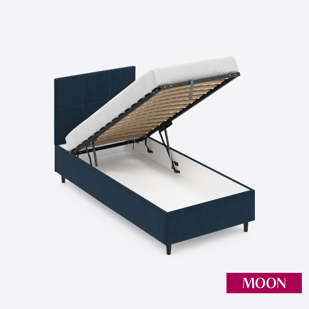 СохранитьКровать односпальная с подъемным механизмом на ножках MOON FAMILY 1261, размер 90х200 см, велюр темно-синий. Ортопедическое основание в комплекте интересное: