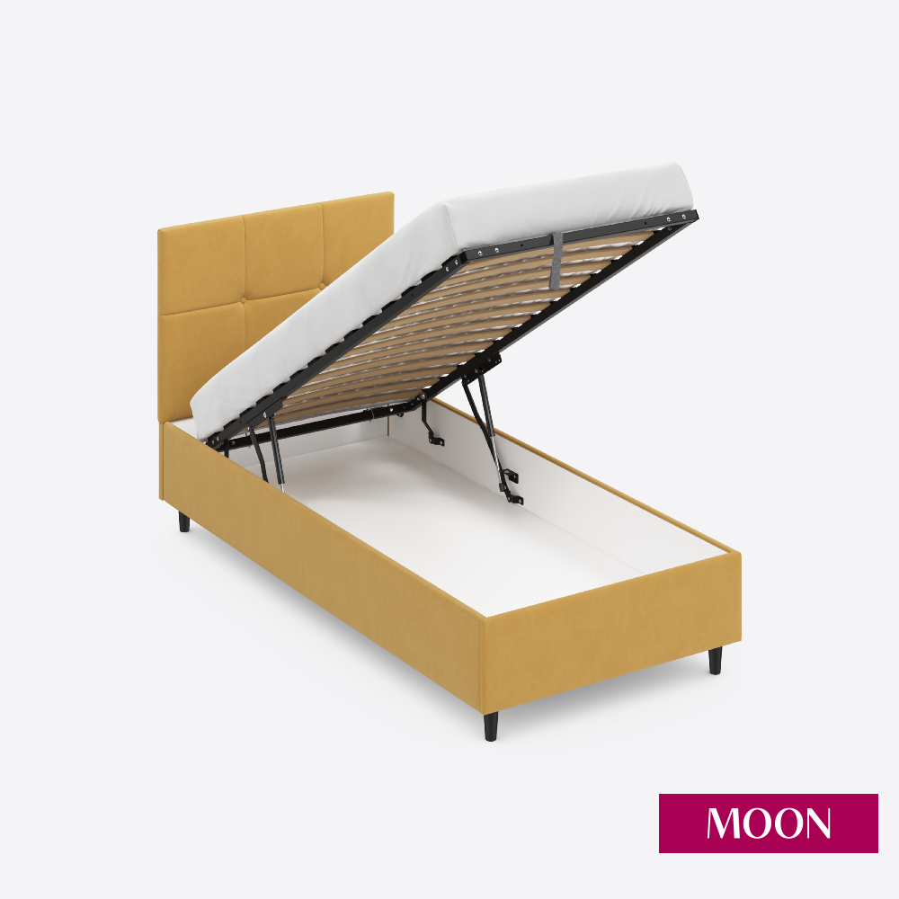 СохранитьКровать односпальная с подъемным механизмом на ножках MOON FAMILY 1261, размер 90х200 см, велюр желтый. Ортопедическое основание в комплекте интересное: