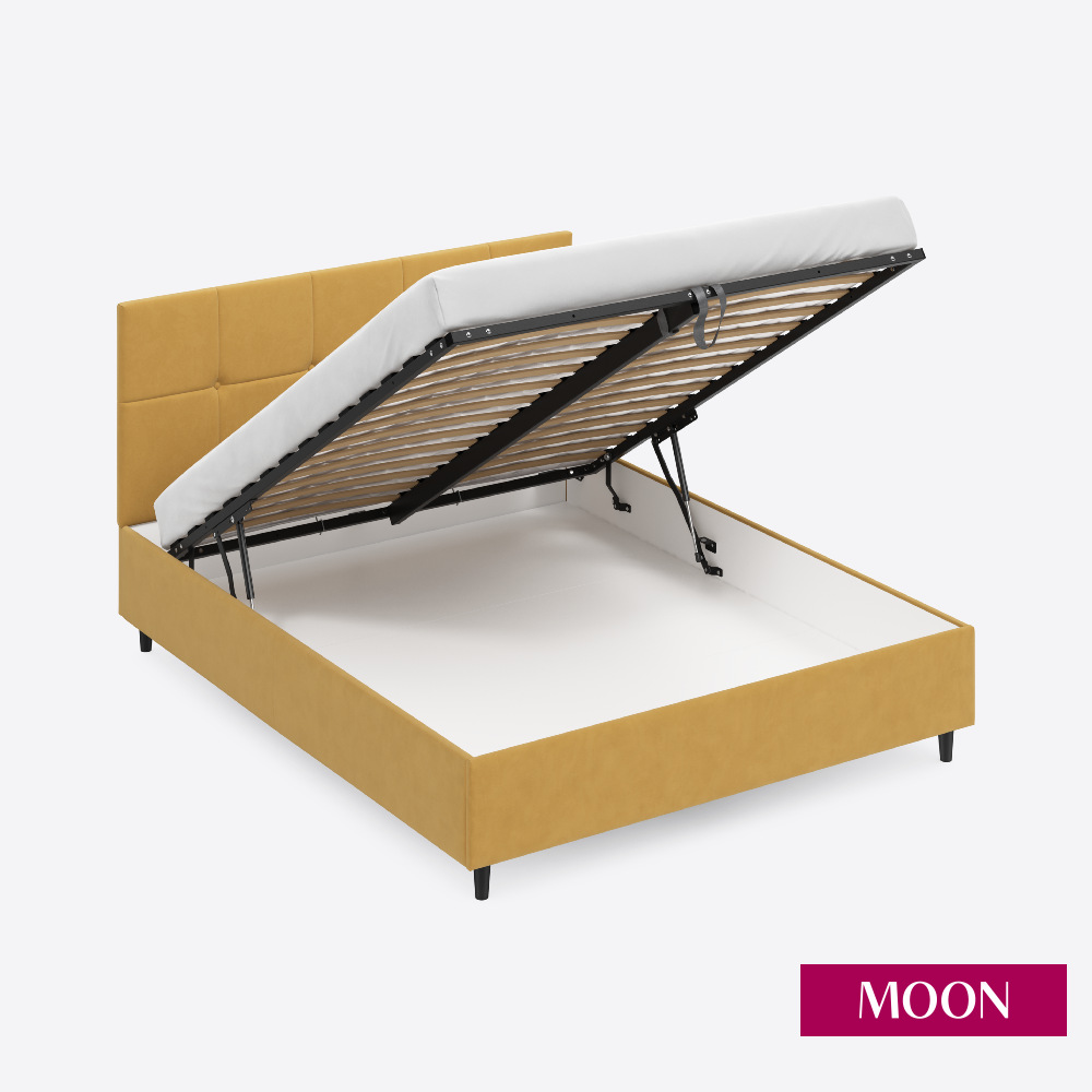 СохранитьКровать двуспальная с подъемным механизмом на ножках MOON FAMILY 1261, размер 180х200 см, велюр желтый. Ортопедическое основание в комплекте интересное: