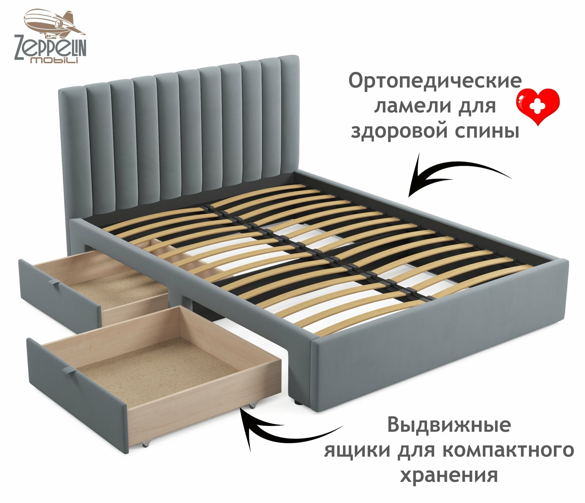 Купить Двуспальная кровать Olivia 1600 серая Zeppelin с ящиками и ортопедическим основанием, 160х200, мягкая из велюра, ламели, выкатные ящики