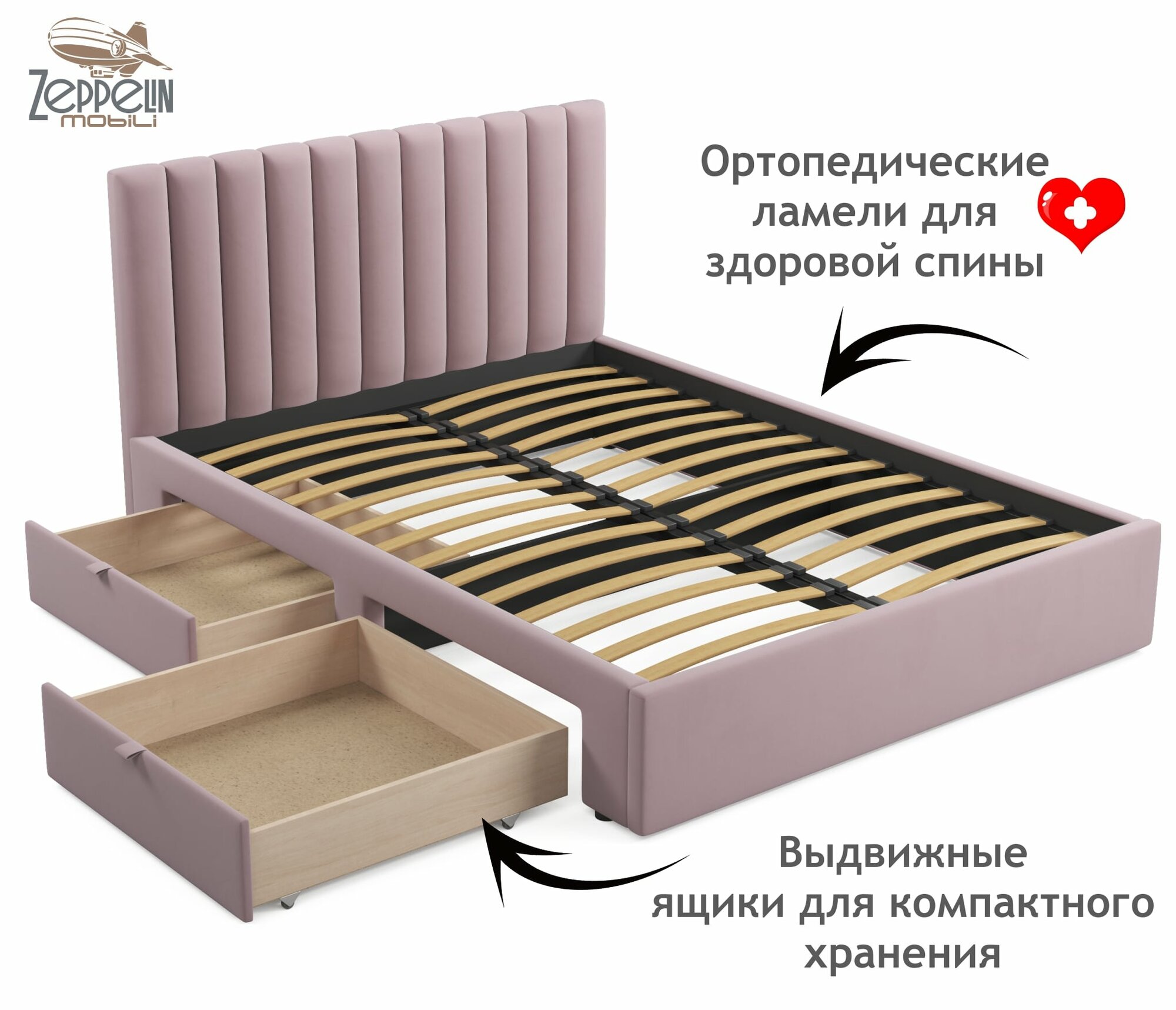 Купить Двуспальная кровать Olivia 1600 лиловая Zeppelin с ящиками и ортопедическим основанием, 160х200, мягкая из велюра, ламели, выкатные ящики