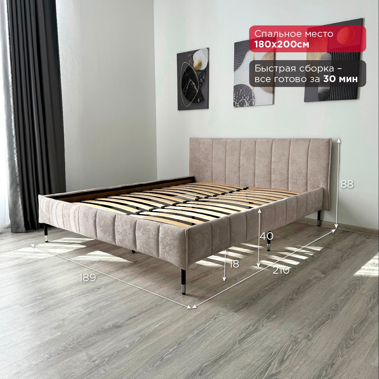 Кровать Redsofa Стелла темно-бежевый Шайн / ножки хром 180х200 с ортопедическим основанием