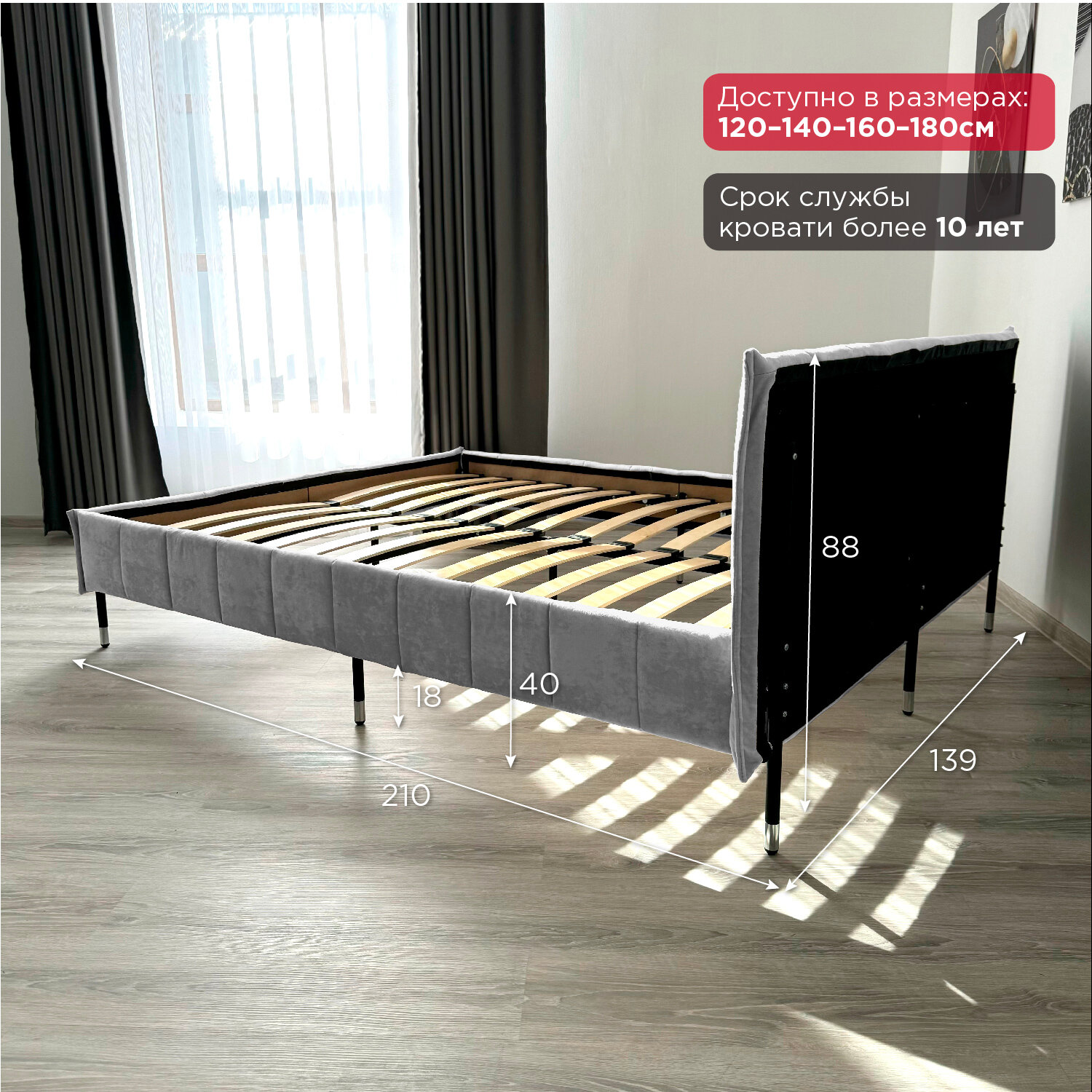 Кровать Redsofa Стелла серый Шайн / ножки хром 140х200 с ортопедическим основанием