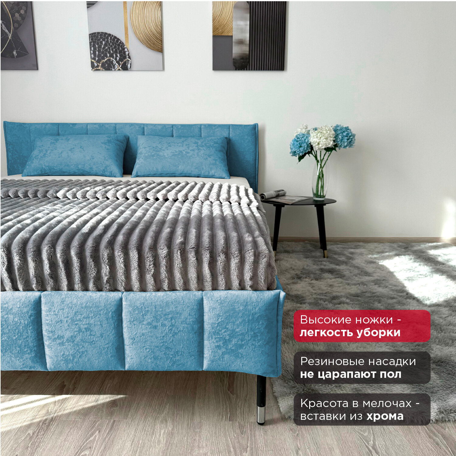 Кровать Redsofa Стелла голубой Ocean / ножки хром 160х200 с ортопедическим основанием