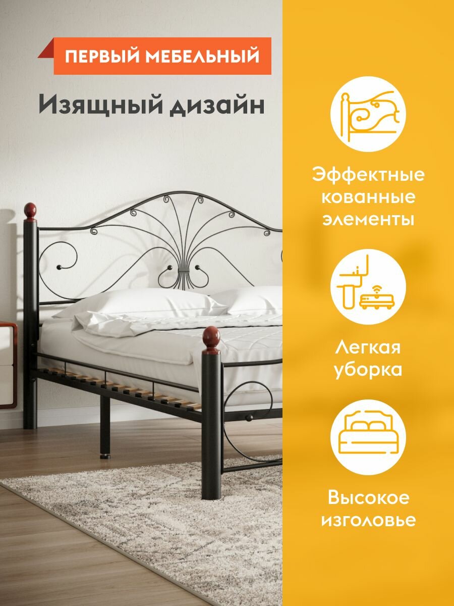 Кровать односпальная металлическая Синди 120х200 см, Черный металл, каркас / Махагон массив, опоры