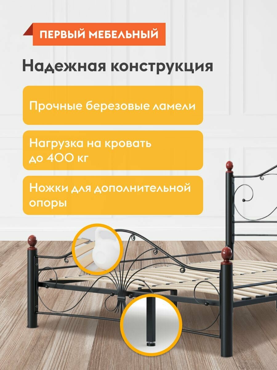 Кровать односпальная металлическая Синди 120х200 см, Черный металл, каркас / Махагон массив, опоры