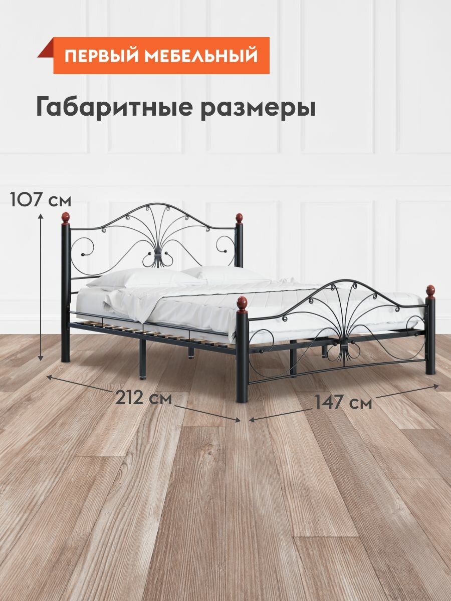 Кровать двуспальная металлическая кровать Синди 140х200 см, Черный металл, каркас / Махагон массив, опоры