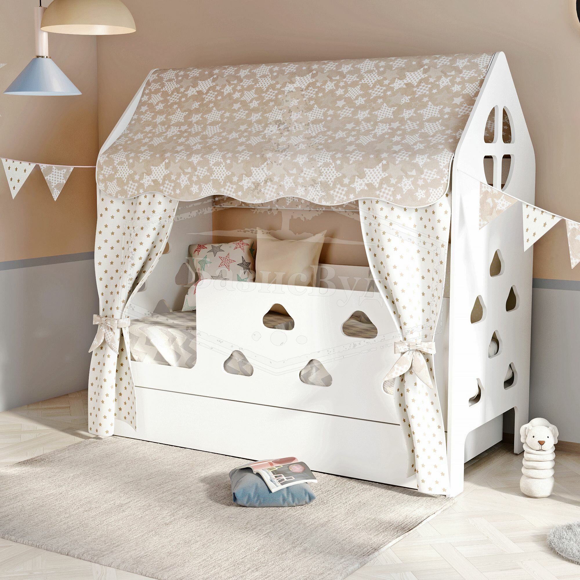 Купить Кровать детская домик с текстилем и ящиком (бежевый, со звездами, вход слева) "Облачка"
