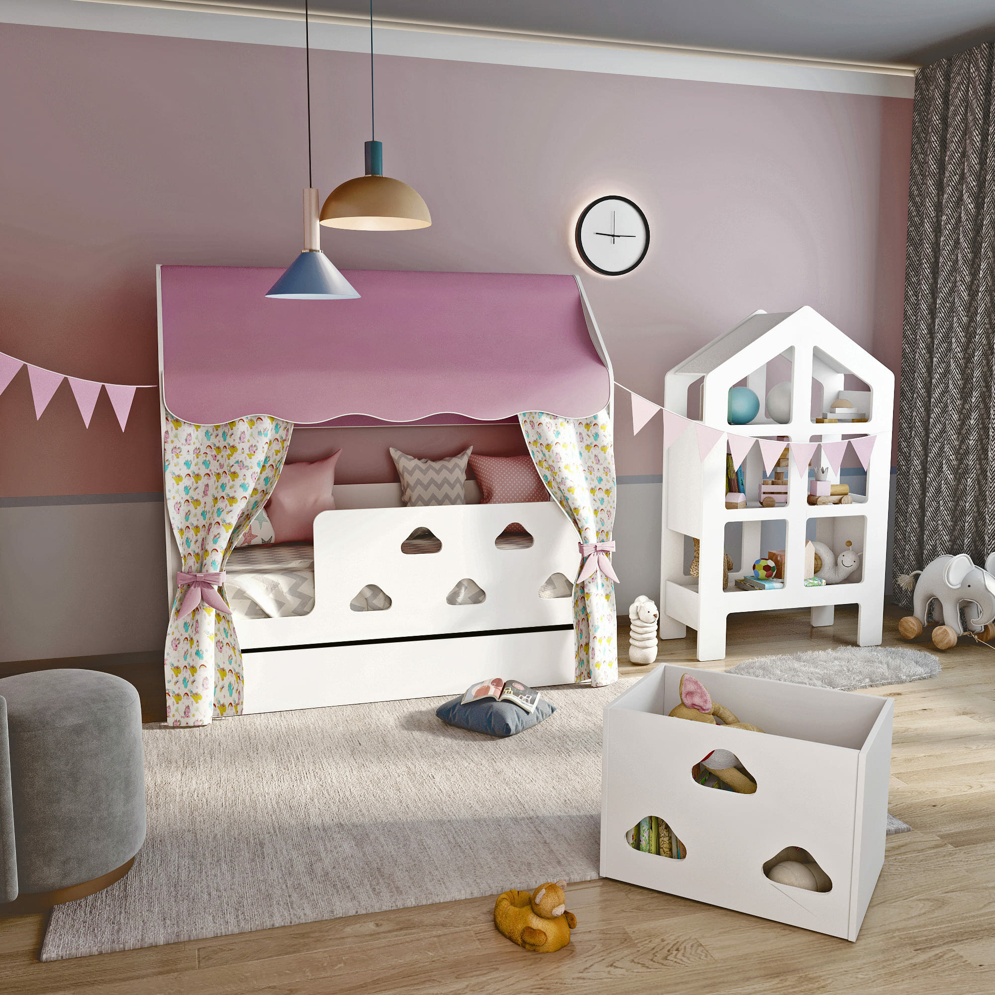 Кровать детская домик "Облачка" с текстилем (розовый, с единорогами, вход слева)