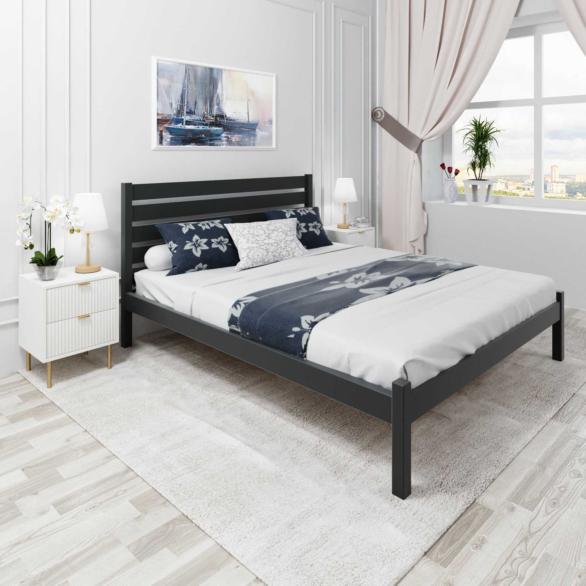 Кровать двуспальная Классика из массива сосны с высокой спинкой и сплошным основанием, 200х120 см (габариты 210х130), цвет антрацит