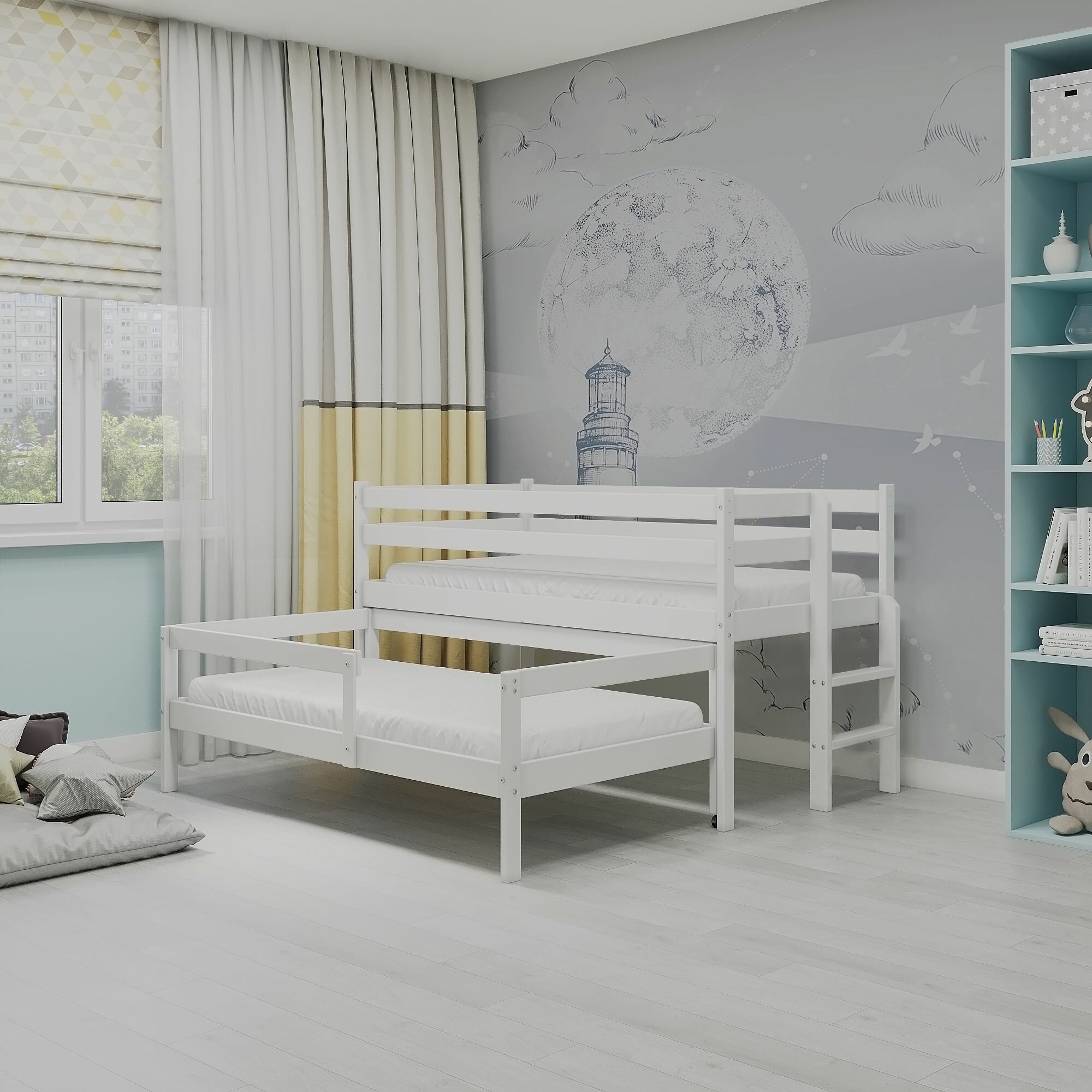 Купить Кровать выдвижная двухъярусная детская, белая , для двоих детей, экологичная , удобная