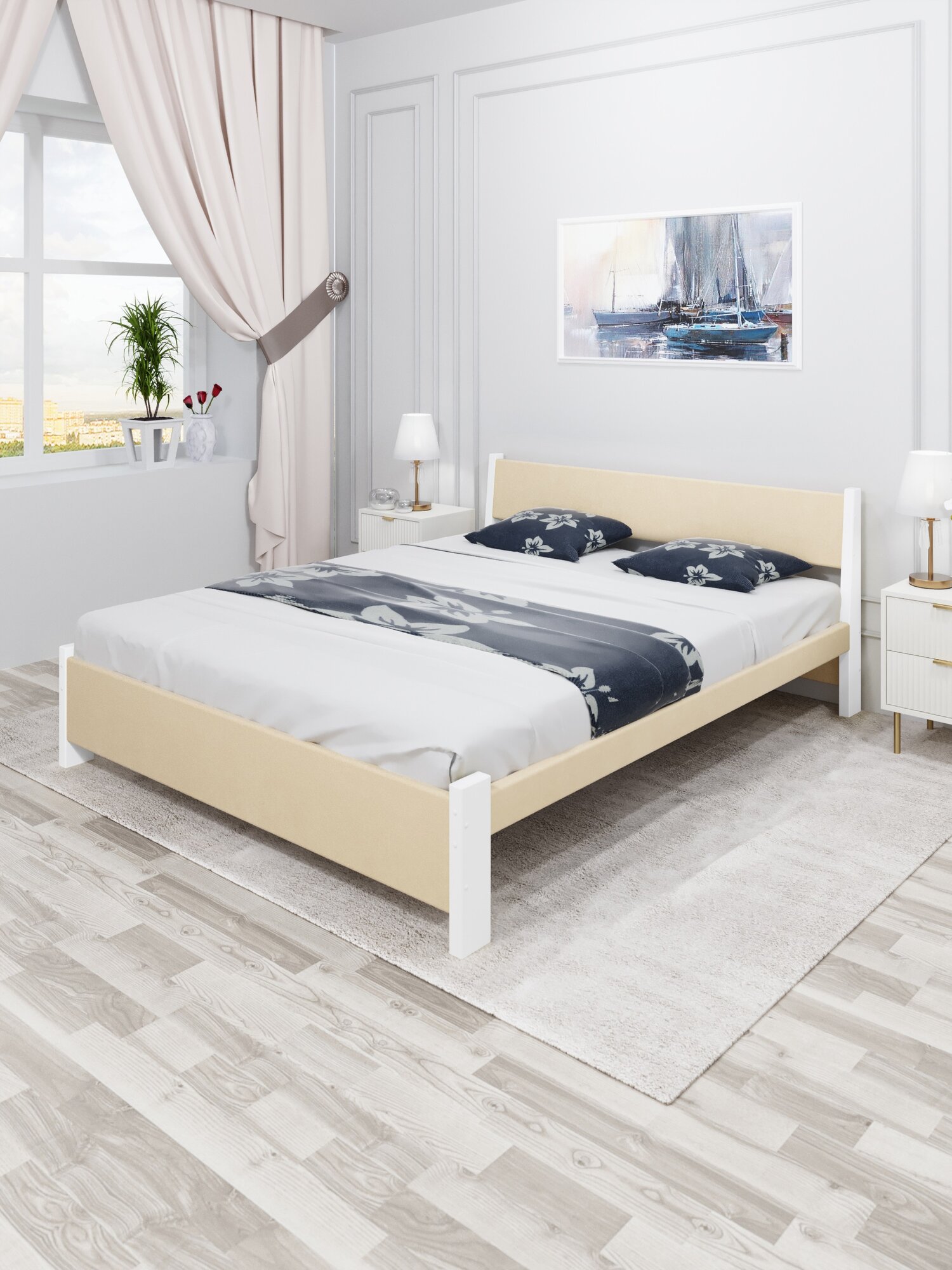 Кровать двуспальная Мишка из массива сосны, 180х200 см, с реечным основанием и бежевой мягкой обивкой, цвет ножек ваниль