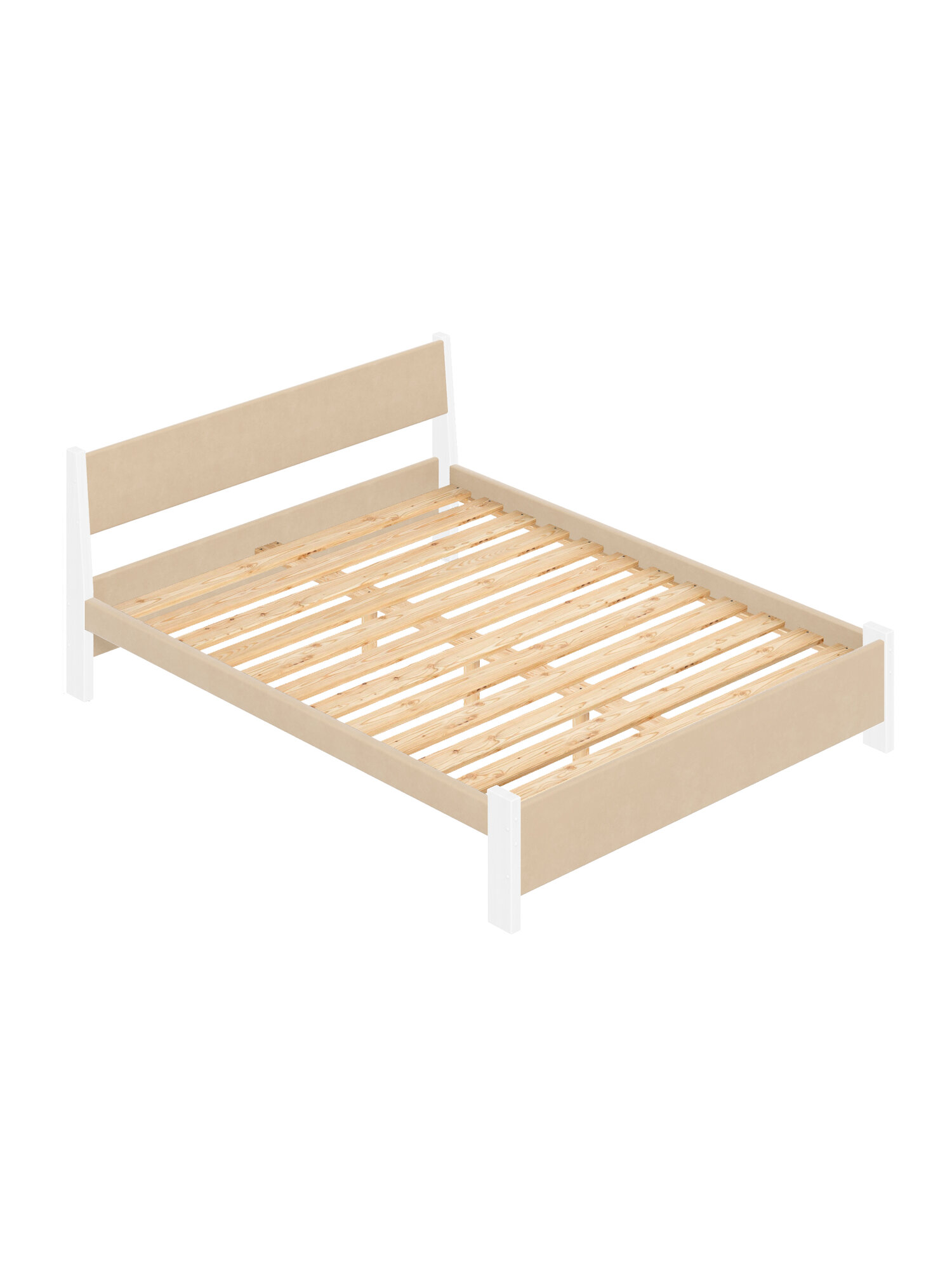 Кровать двуспальная Мишка из массива сосны, 160х200 см, с реечным основанием и бежевой мягкой обивкой, цвет ножек ваниль