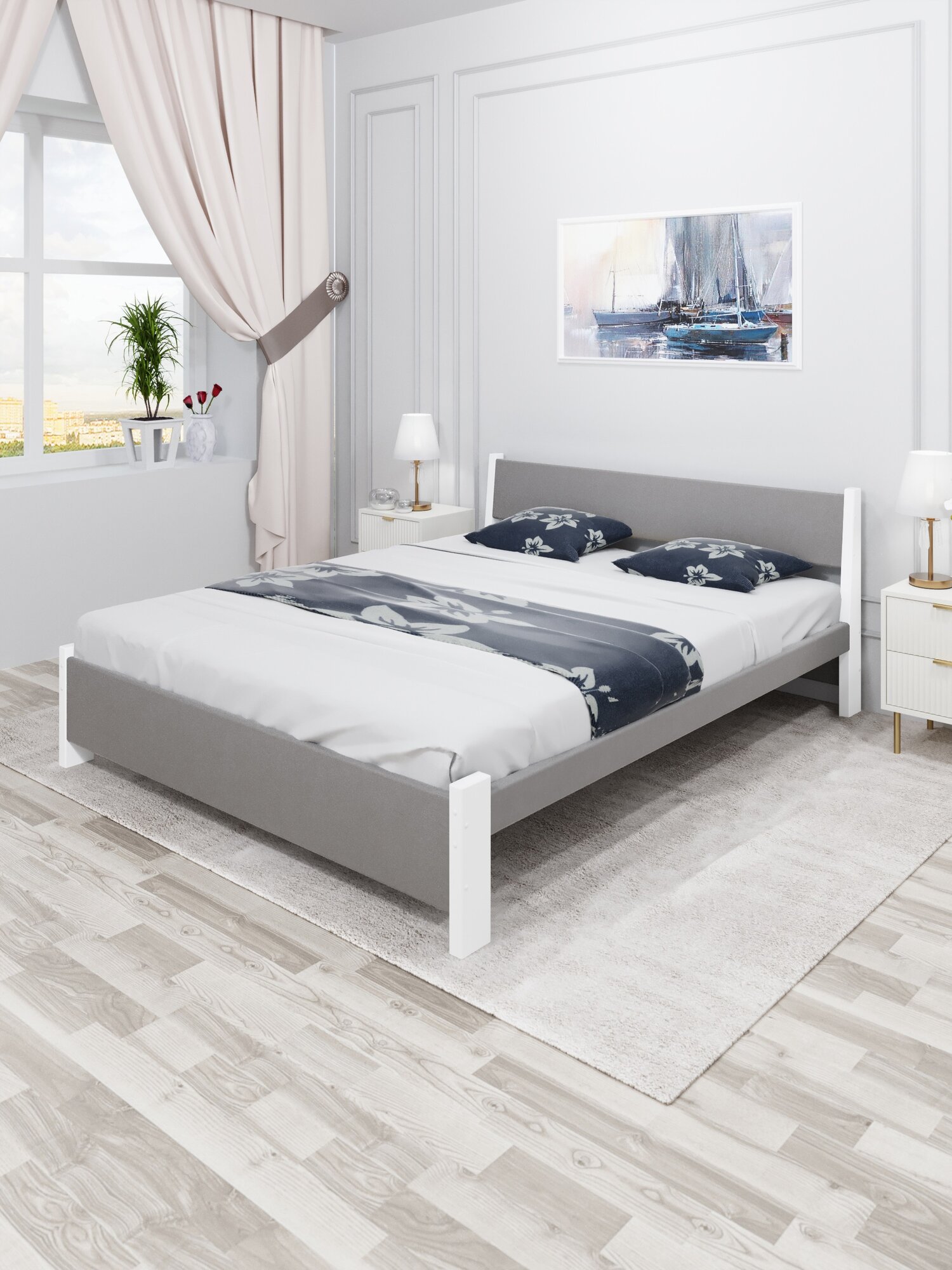 Кровать двуспальная Мишка из массива сосны, 180х200 см, с реечным основанием и светло-серой мягкой обивкой, цвет ножек белый