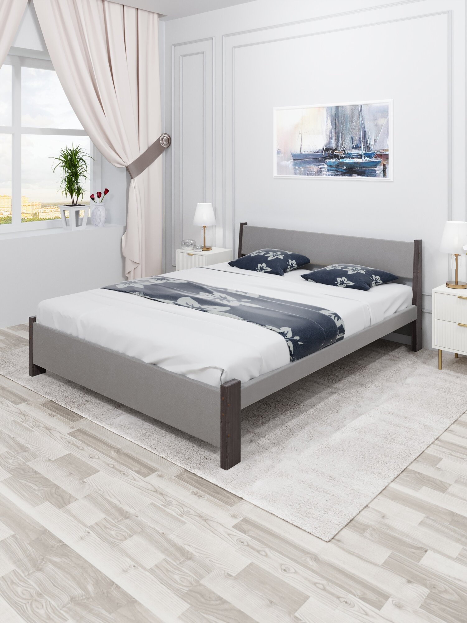 Кровать двуспальная Мишка из массива сосны, 180х200 см, с реечным основанием и светло-серой мягкой обивкой, цвет ножек венге