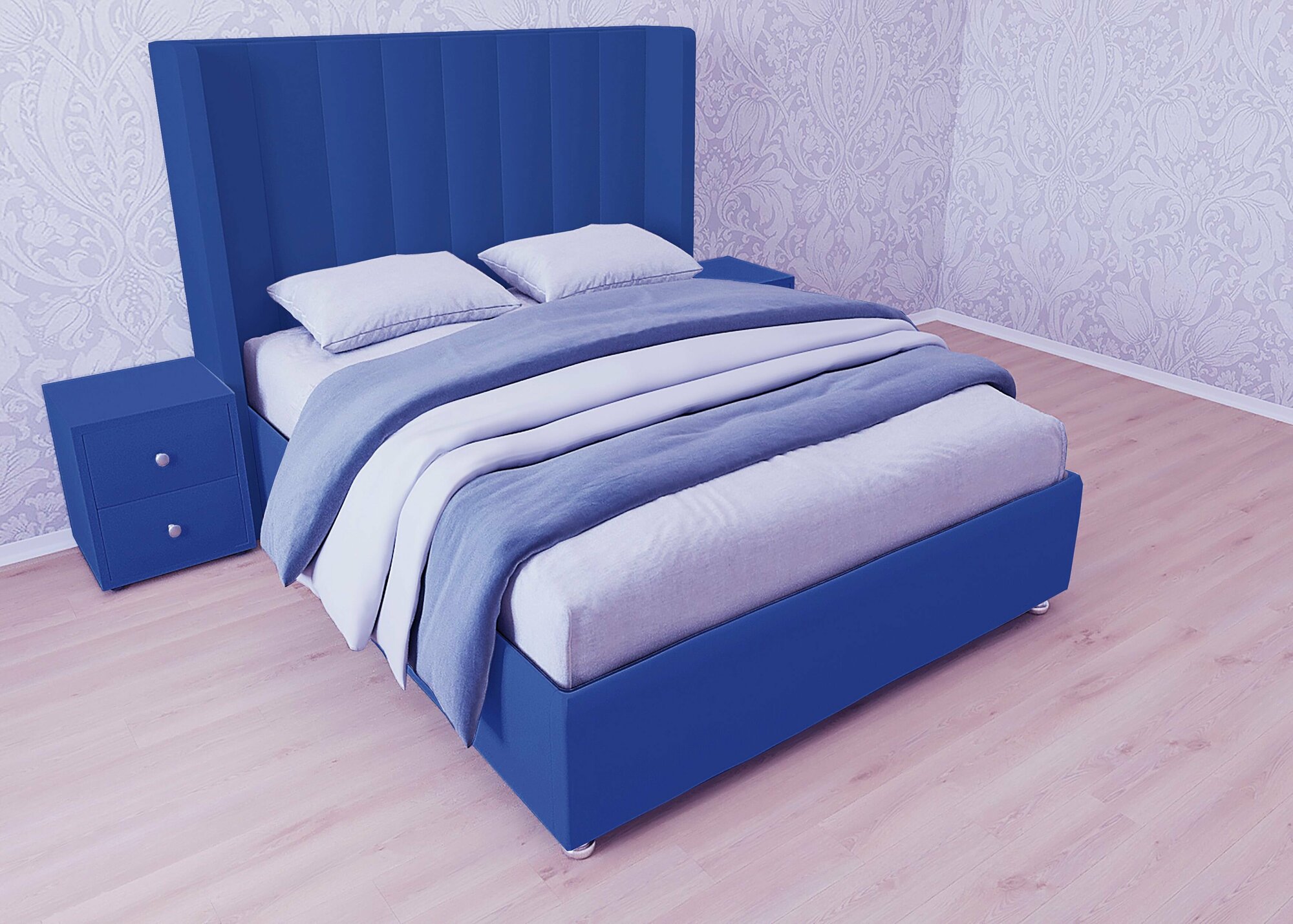 Двуспальная кровать Женева 180x200 с подъемным механизмом и с коробом для белья велюр синий ножки 13 см хром