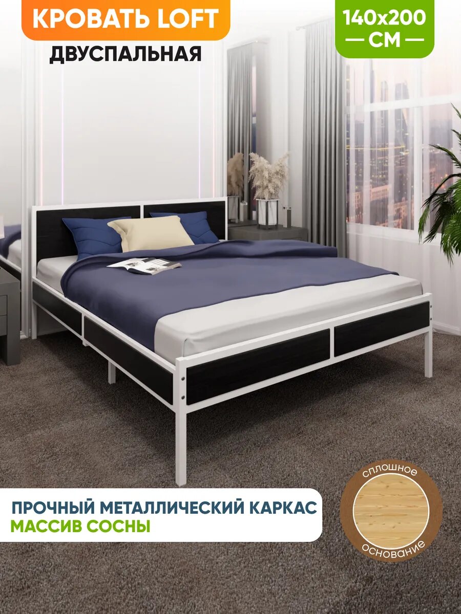 Купить Кровать двуспальная Лофт со сплошным основанием, цвет черного оникса с белым металлическим каркасом, 140х200 см