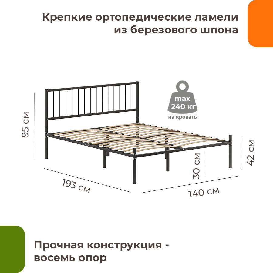 Кровать металлическая Металика Г4 140х200 черная с держателями для матраса и доп. опорами