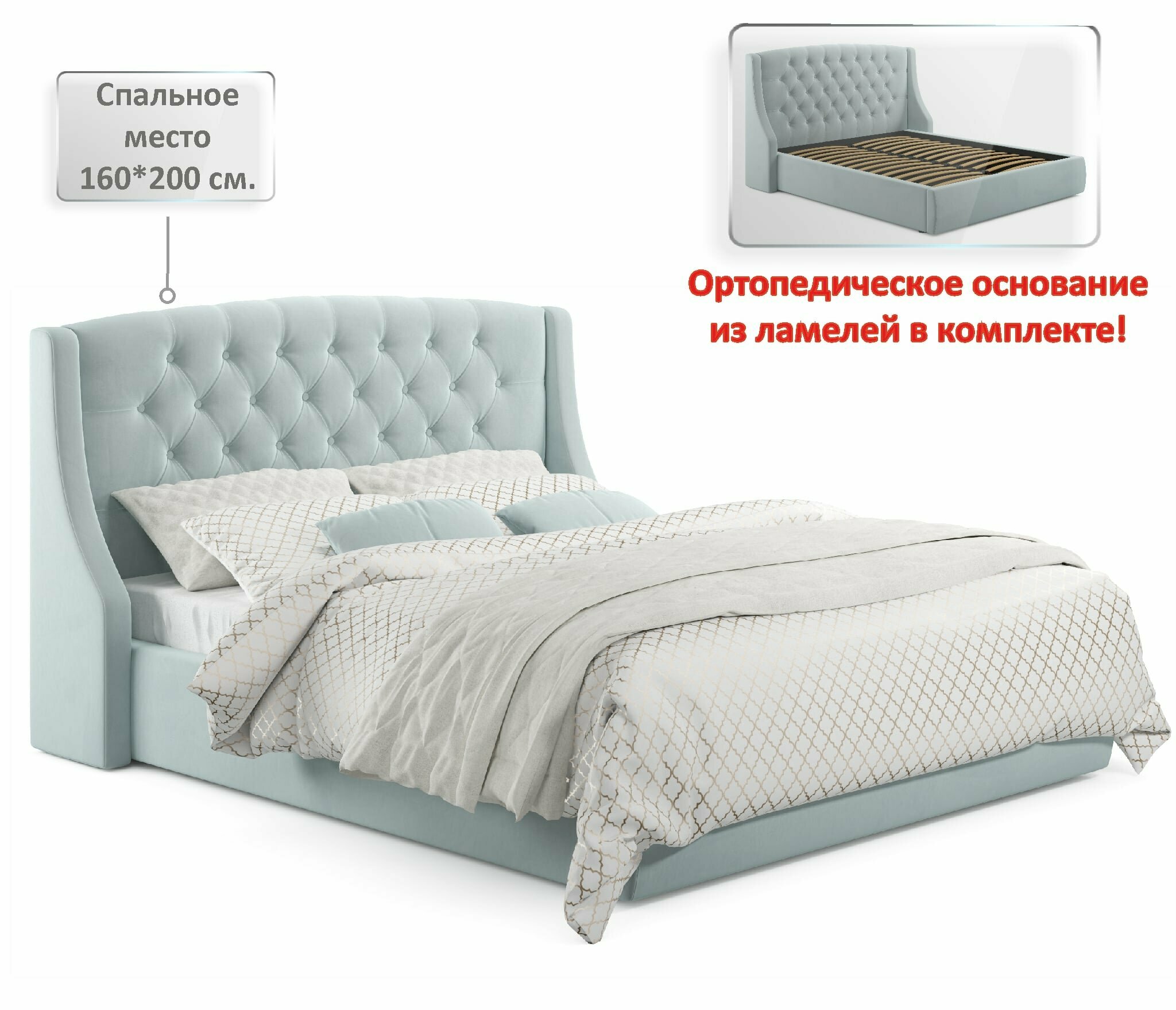 СохранитьДвуспальная кровать Stefani 1600 мята пастель Zeppelin с ортопедическим основанием, 160х200, мягкая из велюра, ламели интересное:
