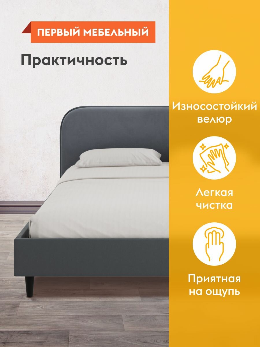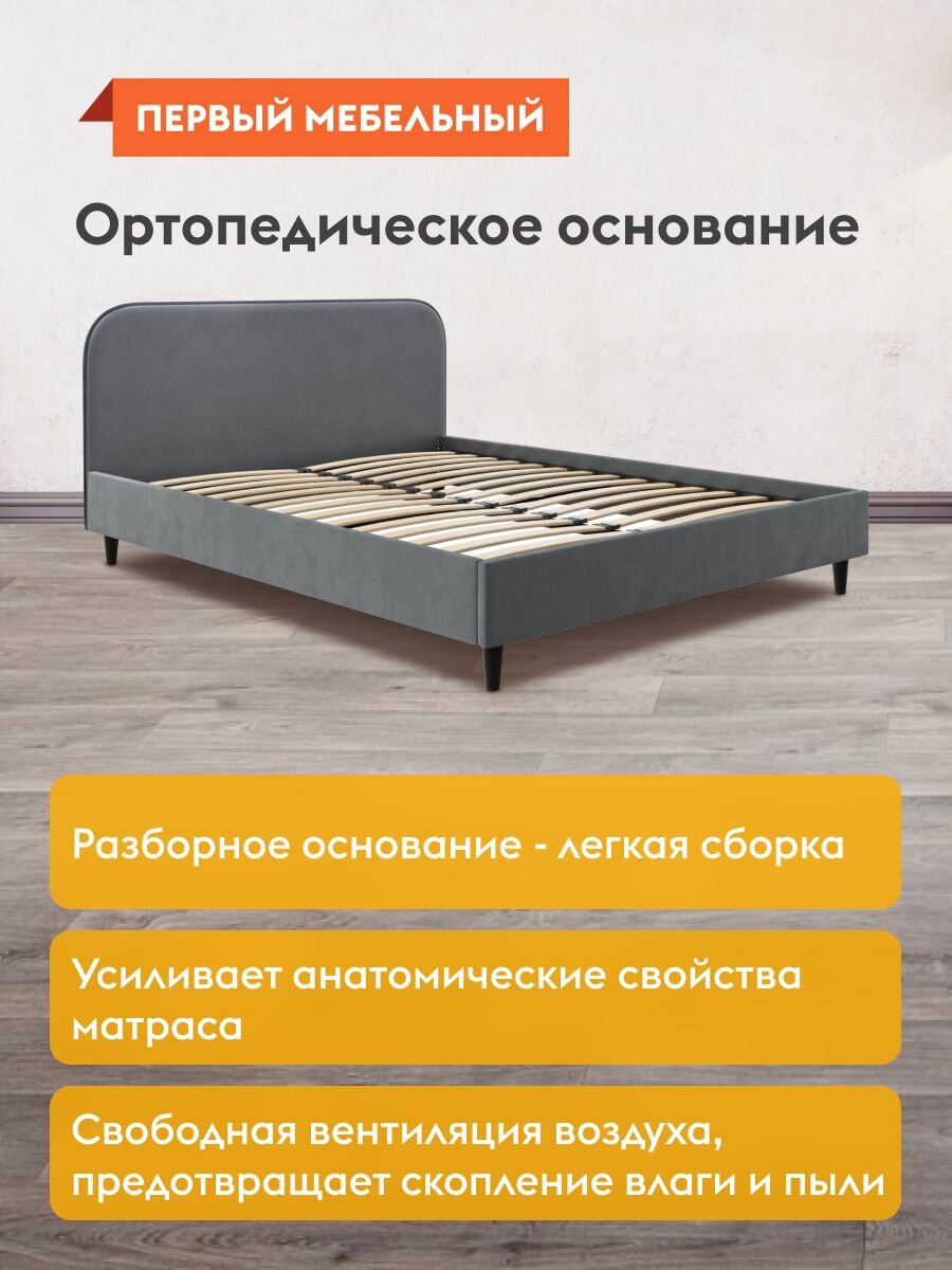 Кровать двуспальная Эни 160х200 см, деревянная, с анатомическим основанием, Серый, велюр