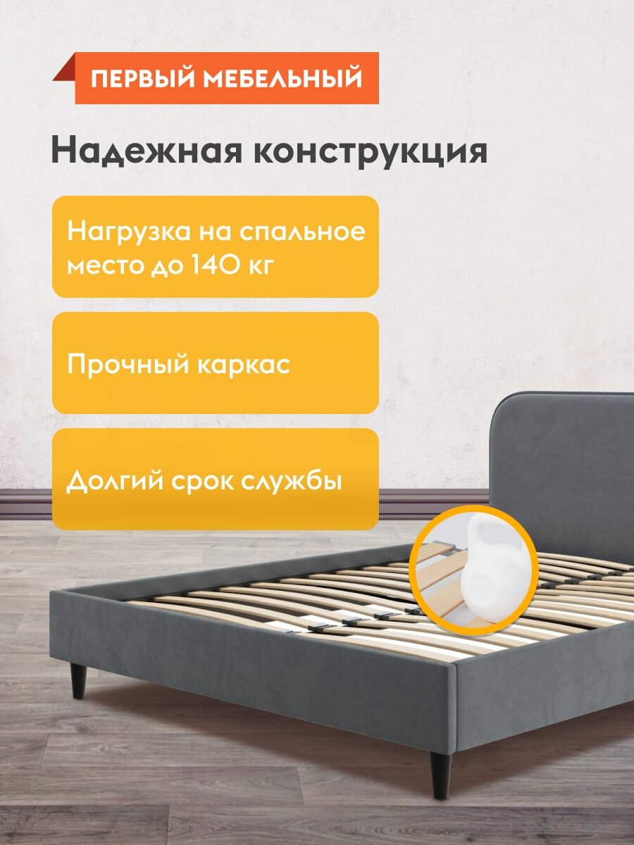 Кровать двуспальная Эни 140х200 см, деревянная, с анатомическим основанием, Серый, велюр