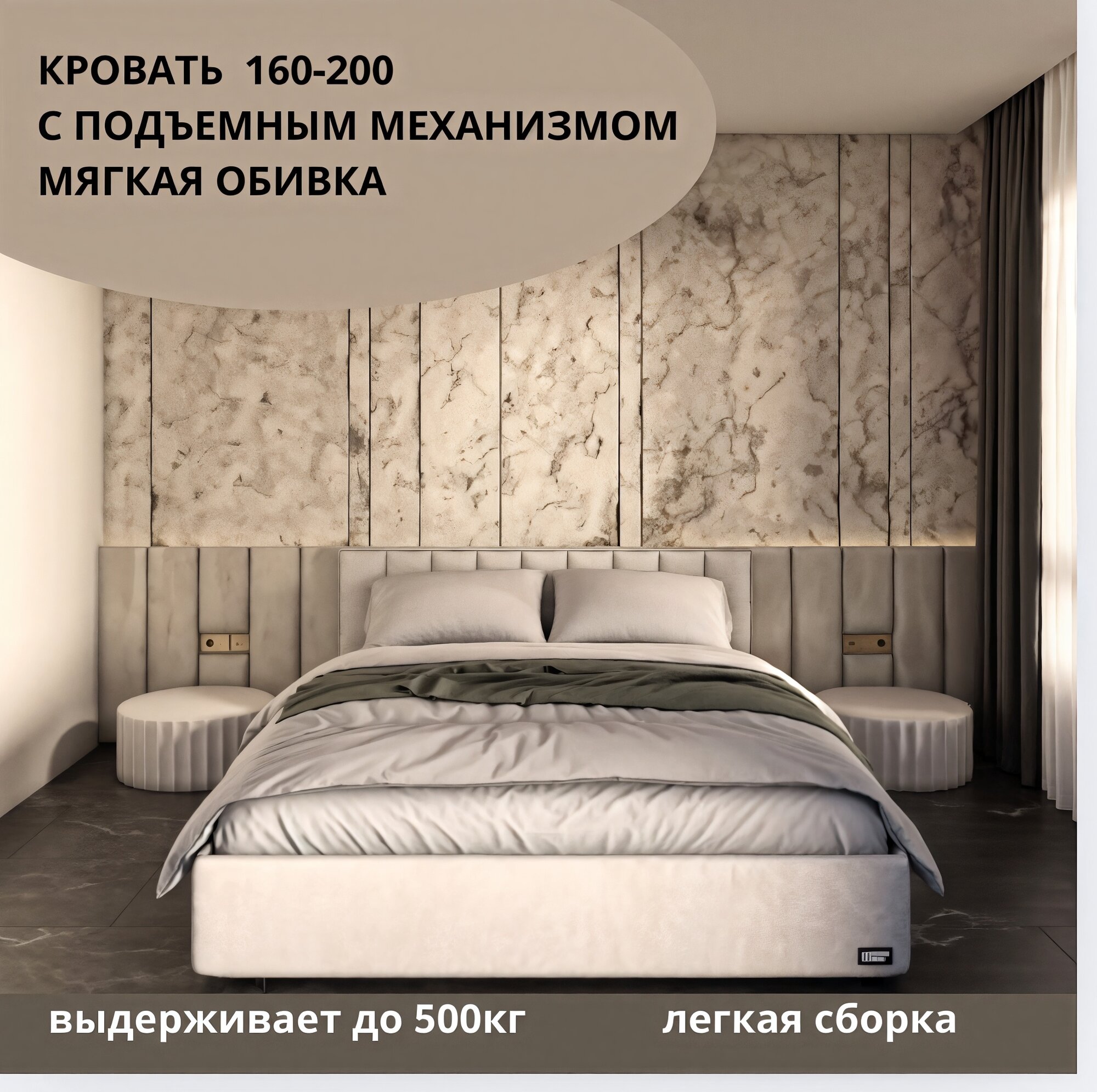 Кровать 180-200 с подъемным механизмом, двухспальная с мягкой обивкой