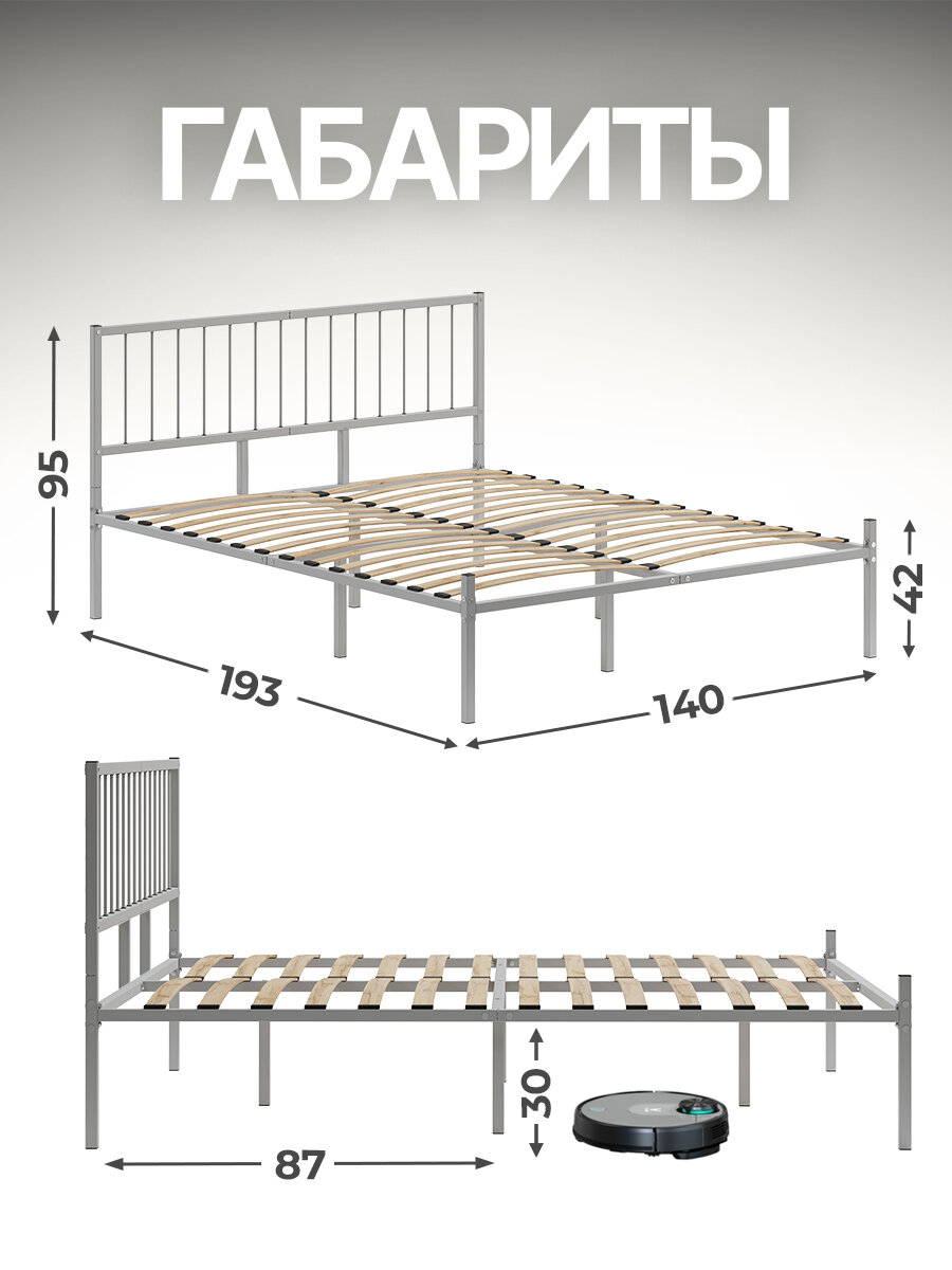 Кровать металлическая Металика В4 140х200 серая с держателями для матраса и доп. опорами